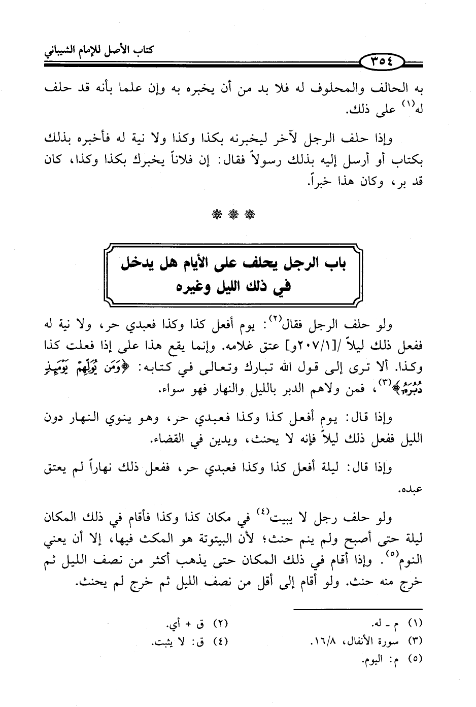 ولو حلف الرجل فقال (¬2): يوم أفعل كذا وكذا فعبدي حر، ولا نية له ففعل ذلك ليلاً عتق غلامه. وإنما يقع هذا على إذا فعلت كذا وكذا. ألا ترى إلى قول الله تبارك وتعالى في كتابه: {وَمَنْ يُوَلِّهِمْ يَوْمَئِذٍ دُبُرَهُ} (¬3)، فمن ولاهم الدبر بالليل والنهار فهو سواء.