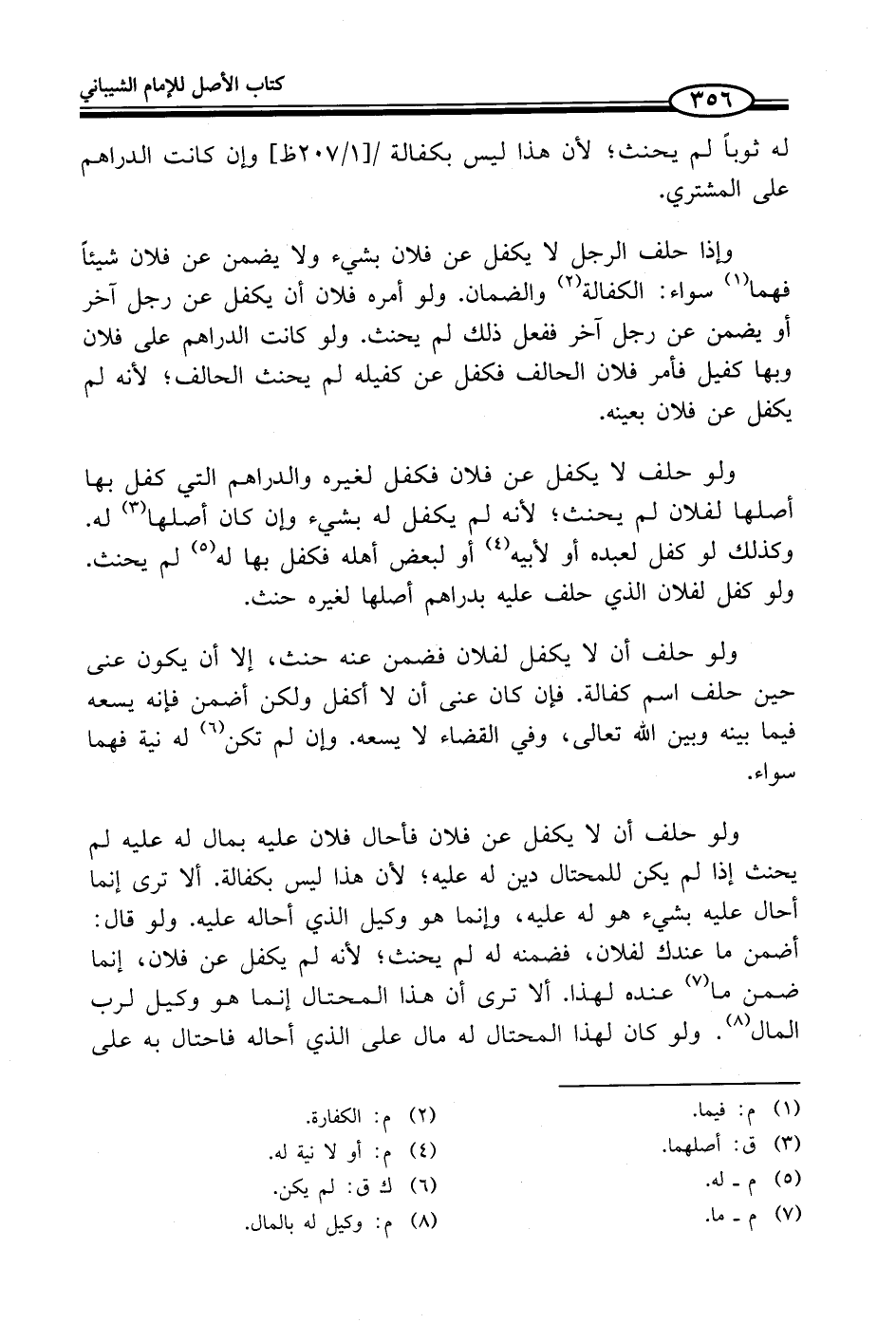 وإذا حلف الرجل لا يكفل عن فلان بشيء ولا يضمن عن فلان شيئاً فهما (¬1) سواء: الكفالة (¬2) والضمان. ولو أمره فلان أن يكفل عن رجل آخر أو يضمن عن رجل آخر ففعل ذلك لم يحنث. ولو كانت الدراهم على فلان وبها كفيل فأمر فلان الحالف فكفل عن كفيله لم يحنث الحالف؛ لأنه لم يكفل عن فلان بعينه.