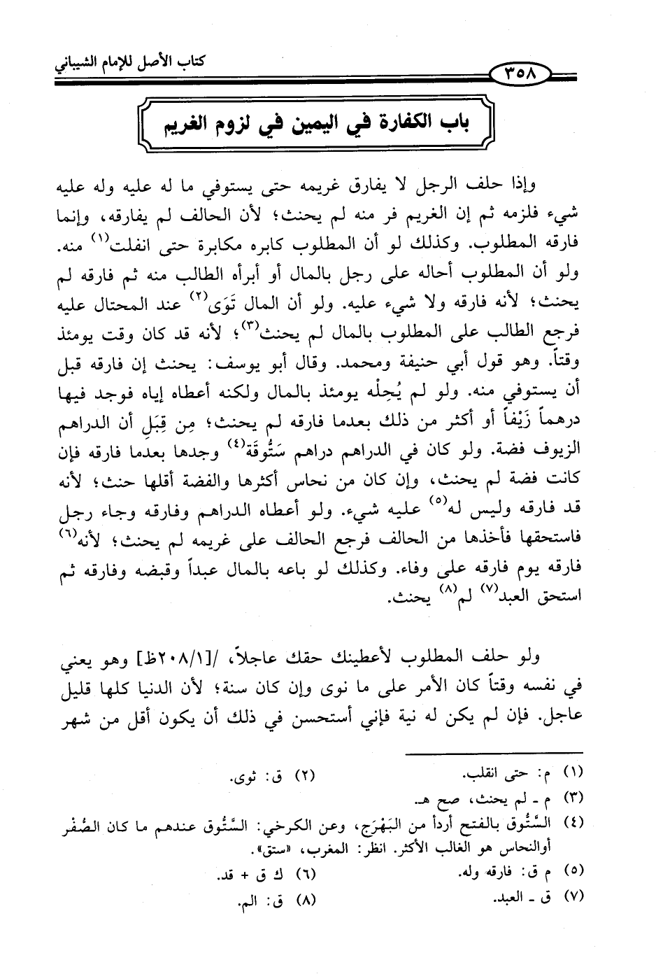 وإذا حلف الرجل لا يفارق غريمه حتى يستوفي ما له عليه وله عليه شيء فلزمه ثم إن الغريم فر منه لم يحنث؛ لأن الحالف لم يفارقه، وإنما فارقه المطلوب. وكذلك لو أن المطلوب كابره مكابرة حتى انفلت (¬1) منه. ولو أن المطلوب أحاله على رجل بالمال أو أبرأه الطالب منه ثم فارقه لم يحنث؛ لأنه فارقه ولا شيء عليه. ولو أن المال تَوَى (¬2) عند المحتال عليه فرجع الطالب على المطلوب بالمال لم يحنث (¬3)، لأنه قد كان وقت يومئذ وقتاً. وهو قول أبي حنيفة ومحمد. وقال أبو يوسف: يحنث إن فارقه قبل أن يستوفي منه. ولو لم يُحِلْه يومئذ بالمال ولكنه أعطاه إياه فوجد فيها درهماً زَيْفاً أو أكثر من ذلك بعدما فارقه لم يحنث؛ مِن قِبَلِ أن الدراهم الزيوف فضة. ولو كان في الدراهم دراهم سَتُّوقَة (¬4) وجدها بعدما فارقه فإن كانت فضة لم يحنث، وإن كان من نحاس أكثرها والفضة أقلها حنث؛ لأنه قد فارقه وليس له (¬5) عليه شيء. ولو أعطاه الدراهم وفارقه وجاء رجل فاستحقها فأخذها من الحالف فرجع الحالف على غريمه لم يحنث؛ لأنه (¬6) فارقه يوم فارقه على وفاء. وكذلك لو باعه بالمال عبداً وقبضه وفارقه ثم استحق العبد (¬7) لم (¬8) يحنث.