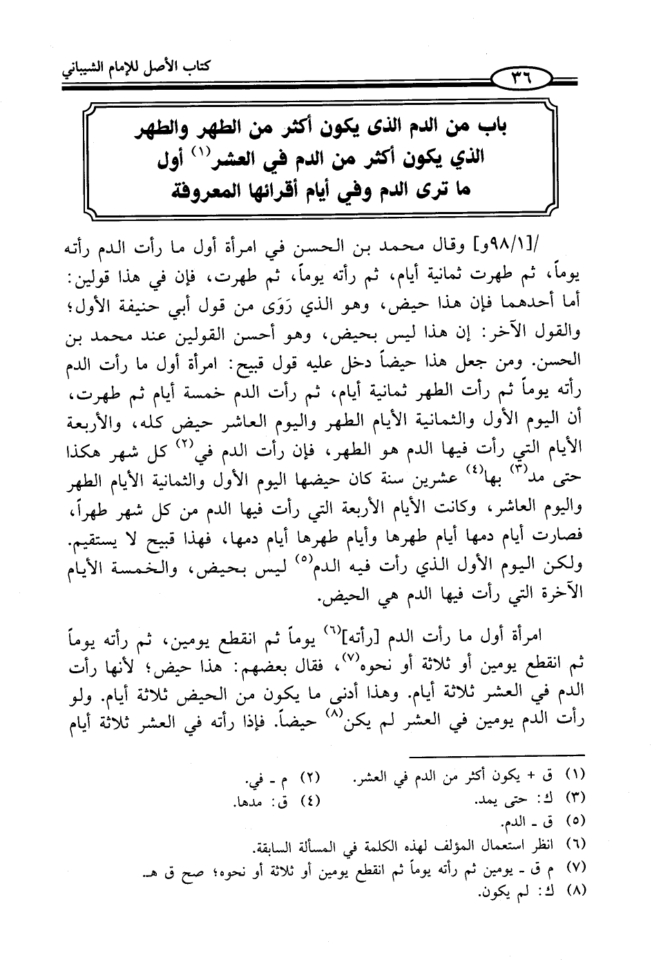 وقال محمد بن الحسن في امرأة أول ما رأت الدم رأته يوماً، ثم طهرت ثمانية أيام، ثم رأته يوماً، ثم طهرت، فإن في هذا قولين: أما أحدهما فإن هذا حيض، وهو الذي رَوَى من قول أبي حنيفة الأول، والقول الآخر: إن هذا ليس بحيض، وهو أحسن القولين عند محمد بن الحسن. ومن جعل هذا حيضاً دخل عليه قول قبيح: امرأة أول ما رأت الدم رأته يوماً ثم رأت الطهر ثمانية أيام، ثم رأت الدم خمسة أيام ثم طهرت، أن اليوم الأول والثمانية الأيام الطهر واليوم العاشر حيض كله، والأربعة الأيام التي رأت فيها الدم هو الطهر، فإن رأت الدم في (¬2) كل شهر هكذا حتى مد (¬3) بها (¬4) عشرين سنة كان حيضها اليوم الأول والثمانية الأيام الطهر واليوم العاشر، وكانت الأيام الأربعة التي رأت فيها الدم من كل شهر طهراً، فصارت أيام دمها أيام طهرها وأيام طهرها أيام دمها، فهذا قبيح لا يستقيم. ولكن اليوم الأول الذي رأت فيه الدم (¬5) ليس بحيض، والخمسة الأيام الآخرة التي رأت فيها الدم هي الحيض.