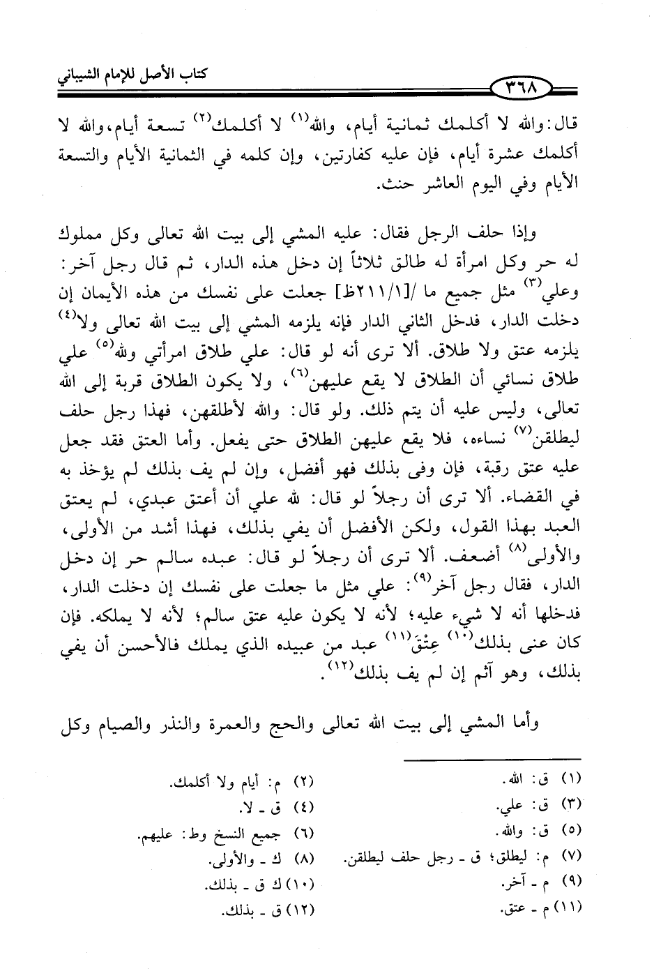 فإذا حلف الرجل فقال: عليه المشي إلى بيت الله تعالى وكل مملوك له حر وكل امرأة له طالق ثلاثاً إن دخل هذه الدار، ثم قال رجل آخر: وعلي (¬3) مثل جميع ما جعلت على نفسك من هذه الأيمان إن دخلت الدار، فدخل الثاني الدار فإنه يلزمه المشي إلى بيت الله تعالى ولا (¬4) يلزمه عتق ولا طلاق. ألا ترى أنه لو قال: علي طلاق امرأتي ولله (¬5) علي طلاق نسائي أن الطلاق لا يقع عليهن (¬6)، ولا يكون الطلاق قربة إلى الله تعالى، وليس عليه أن يتم ذلك. ولو قال: والله لأطلقهن، فهذا رجل حلف ليطلقن (¬7) نساءه، فلا يقع عليهن الطلاق حتى يفعل. وأما العتق فقد جعل عليه عتق رقبة، فإن وفى بذلك فهو أفضل، وان لم يف بذلك لم يؤخذ به في القضاء. ألا ترى أن رجلاً لو قال: لله علي أن أعتق عبدي، لم يعتق العبد بهذا القول، ولكن الأفضل أن يفي بذلك، فهذا أشد من الأولى، والأولى (¬8) أضعف. ألا ترى أن رجلاً لو قال: عبده سالم حر إن دخل الدار، فقال رجل آخر (¬9): علي مثل ما جعلت على نفسك إن دخلت الدار، فدخلها أنه لا شيء عليه؛ لأنه لا يكون عليه عتق سالم؛ لأنه لا يملكه. فإن كان عنى بذلك (¬10) عِتْقَ (¬11) عبد من عبيده الذي يملك فالأحسن أن يفي بذلك، وهو آثم إن لم يف بذلك (¬12).