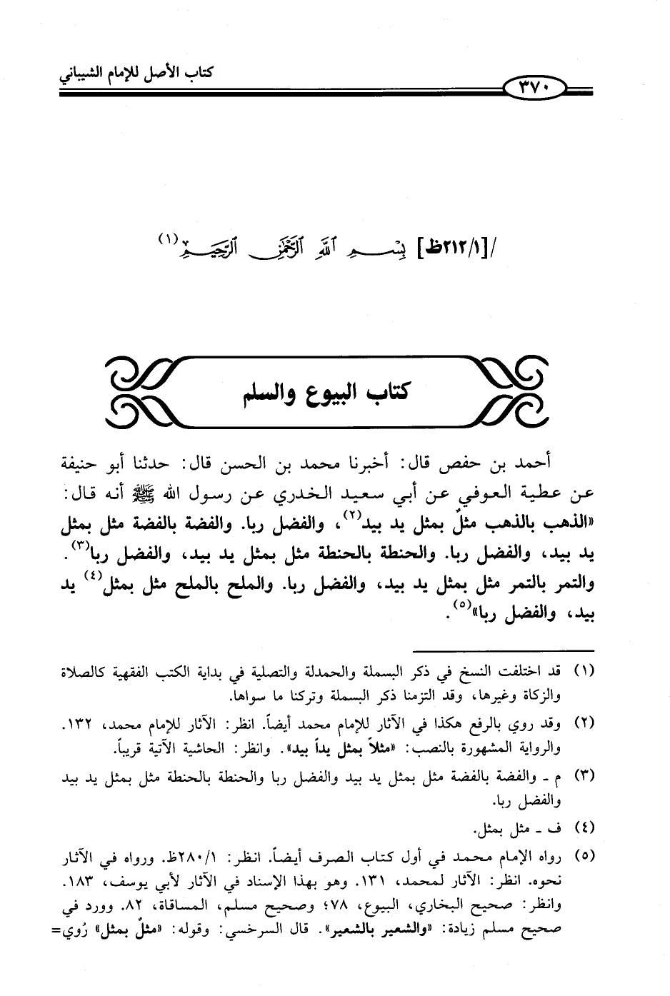 أحمد بن حفص قال: أخبرنا محمد بن الحسن قال: حدثنا أبو حنيفة عن عطية العوفي عن أبي سعيد الخدري عن رسول الله - صلى الله عليه وسلم - أنه قال: "الذهب بالذهب مثل بمثل يد بيد (¬2)، والفضل ربا. والفضة بالفضة مثل بمثل يد بيد، والفضل ربا. والحنطة بالحنطة مثل بمثل يد بيد، والفضل ربا (¬3). والتمر بالتمر مثل بمثل يد بيد، والفضل ربا. والملح بالملح مثل بمثل (¬4) يد بيد، والفضل ربا" (¬5).
