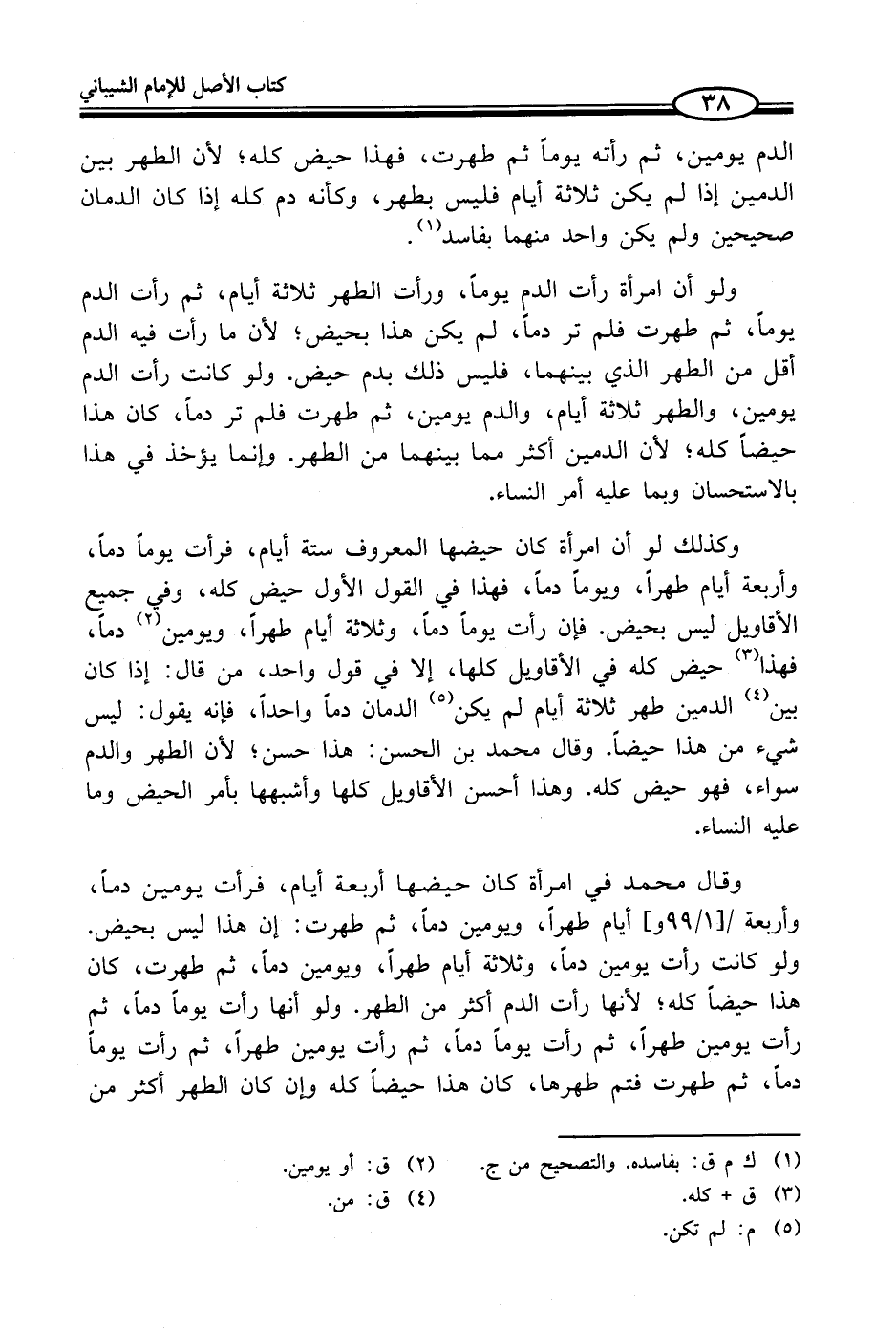 وكذلك لو أن امرأة كان حيضها المعروف ستة أيام، فرأت يوماً دماً، وأربعة أيام طهراً، ويوماً دماً، فهذا في القول الأول حيض كله، وفي جميع الأقاويل ليس بحيض. فإن رأت يوماً دماً، وثلاثة أيام طهراً، ويومين (¬2) دماً، فهذا (¬3) حيض كله في الأقاويل كلها، إلا في قول واحد، من قال: إذا كان بين (¬4) الدمين طهر ثلاثة أيام لم يكن (¬5) الدمان دماً واحداً، فإنه يقول: ليس شيء من هذا حيضاً. وقال محمد بن الحسن: هذا حسن؛ لأن الطهر والدم سواء، فهو حيض كله. وهذا أحسن الأقاويل كلها وأشبهها بأمر الحيض وما عليه النساء.