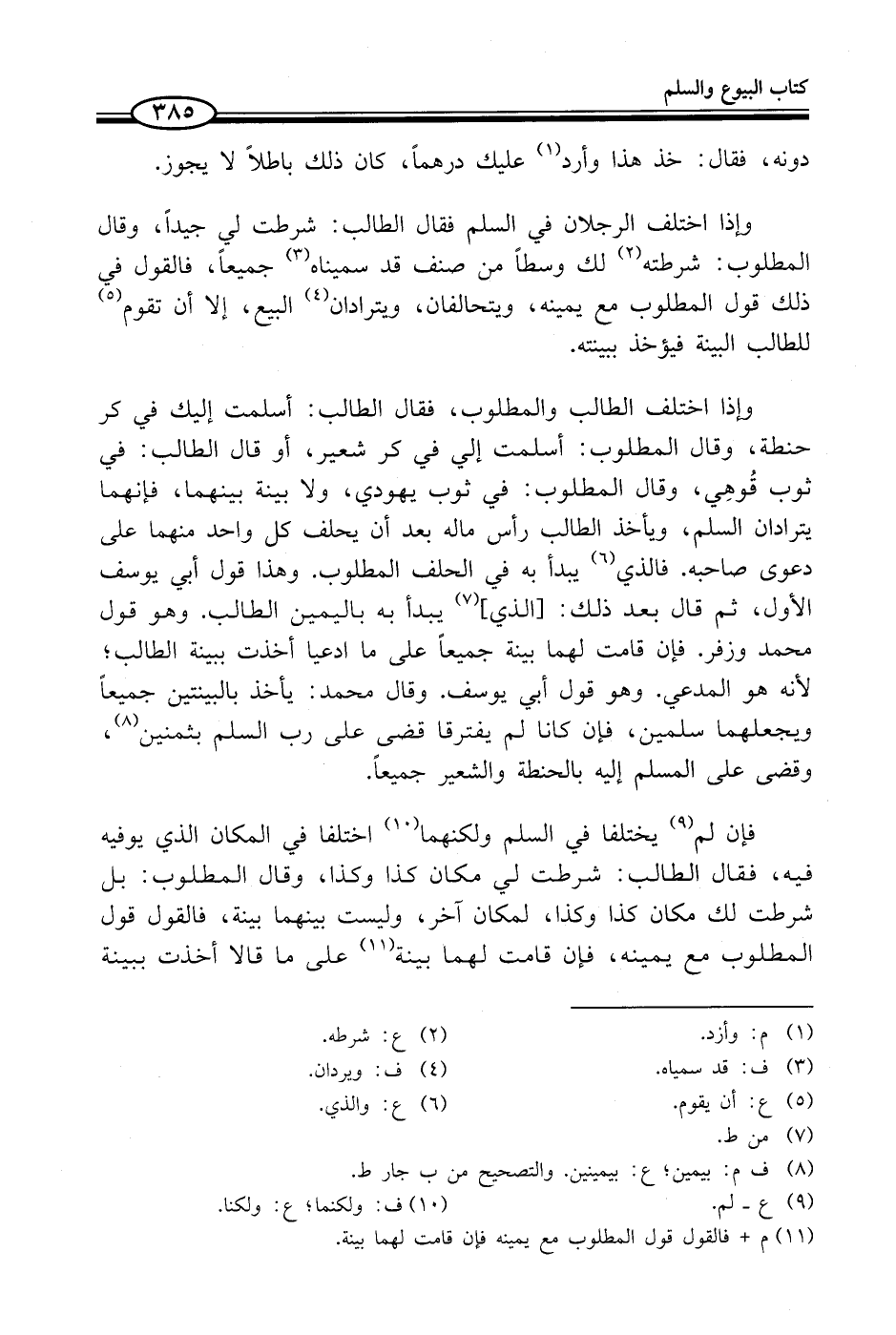وإذا اختلف الطالب والمطلوب، فقال الطالب: أسلمت إليك في كر حنطة، وقال المطلوب: أسلمت إلي في كر شعير، أو قال الطالب: في ثوب قُوهِي، وقال المطلوب: في ثوب يهودي، ولا بينة بينهما، فإنهما يترادان السلم، ويأخذ الطالب رأس ماله بعد أن يحلف كل واحد منهما على دعوى صاحبه. فالذي (¬6) يبدأ به في الحلف المطلوب. وهذا قول أبي يوسف الأول، ثم قال بعد ذلك: [الذي] (¬7) يبدأ به باليمين الطالب. وهو قول محمد وزفر. فإن قامت لهما بينة جميعاً على ما ادعيا أخذت ببينة الطالب؛ لأنه هو المدعي. وهو قول أبي يوسف. وقال محمد: يأخذ بالبينتين جميعاً ويجعلهما سلمين، فإن كانا لم يفترقا قضى على رب السلم بثمنين (¬8)، وقضى على المسلم إليه بالحنطة والشعير جميعاً.