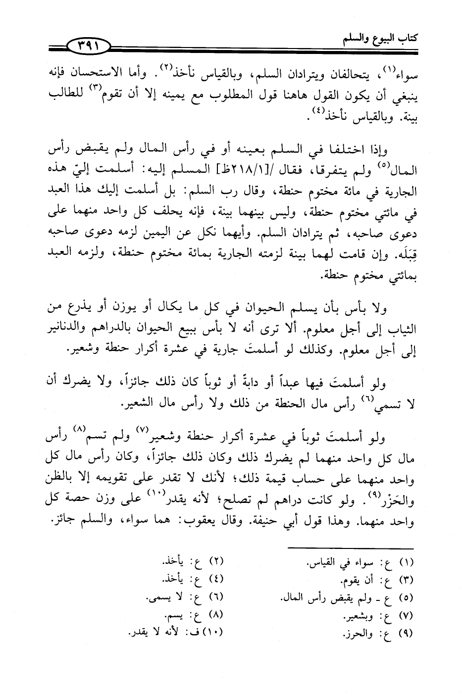 ولا بأس بأن يسلم الحيوان في كل ما يكال أو يوزن أو يذرع من الثياب إلى أجل معلوم. ألا ترى أنه لا بأس ببيع الحيوان بالدراهم والدنانير إلى أجل معلوم. وكذلك لو أسلمتَ جارية في عشرة أكرار حنطة وشعير.