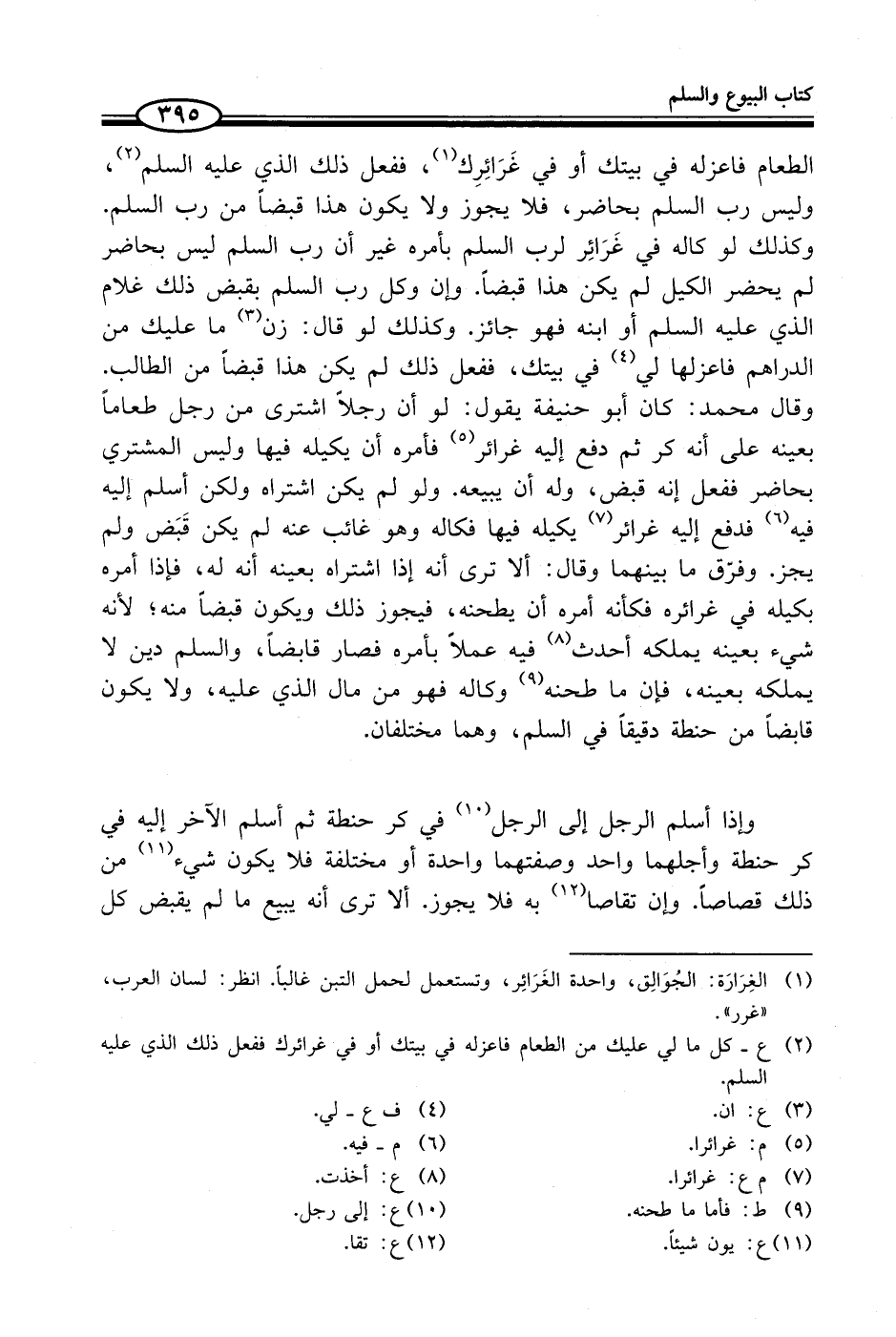 الطعام فاعزله في بيتك أو في غَرَائِرِك (¬1)، ففعل ذلك الذي عليه السلم (¬2)، وليس رب السلم بحاضر، فلا يجوز ولا يكون هذا قبضاً من رب السلم. وكذلك لو كاله في غَرَائِر لرب السلم بأمره غير أن رب السلم ليس بحاضر لم يحضر الكيل لم يكن هذا قبضاً. وإن وكل رب السلم بقبض ذلك غلام الذي عليه السلم أو ابنه فهو جائز. وكذلك لو قال: زن (¬3) ما عليك من الدراهم فاعزلها لي (¬4) في بيتك، ففعل ذلك لم يكن هذا قبضاً من الطالب. وقال محمد: كان أبو حنيفة يقول: لو أن رجلاً اشترى من رجل طعاماً بعينه على أنه كر ثم دفع إليه غرائر (¬5) فأمره أن يكيله فيها وليس المشتري بحاضر ففعل إنه قبض، وله أن يبيعه. ولو لم يكن اشتراه ولكن أسلم إليه فيه (¬6) فدفع إليه غرائر (¬7) يكيله فيها فكاله وهو غائب عنه لم يكن قَبَض ولم يجز. وفرّق ما بينهما وقال: ألا ترى أنه إذا اشتراه بعينه أنه له، فإذا أمره بكيله في غرائره فكأنه أمره أن يطحنه، فيجوز ذلك ويكون قبضاً منه؛ لأنه شيء بعينه يملكه أحدث (¬8) فيه عملاً بأمره فصار قابضاً، والسلم دين لا يملكه بعينه، فإن ما طحنه (¬9) وكاله فهو من مال الذي عليه، ولا يكون قابضاً من حنطة دقيقاً في السلم، وهما مختلفان.