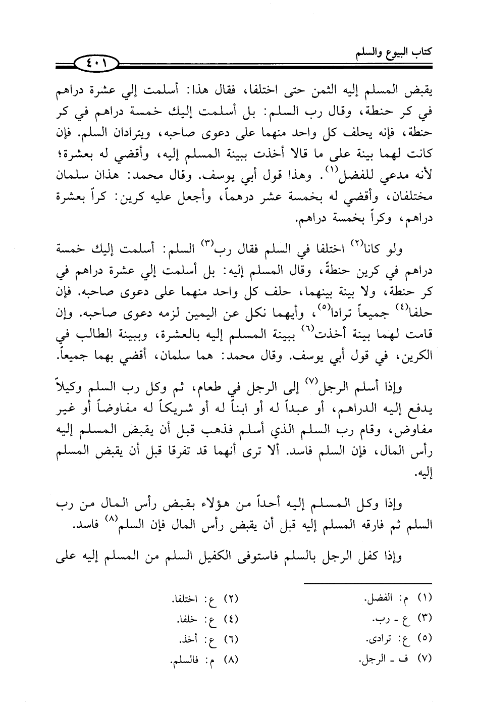 يقبض المسلم إليه الثمن حتى اختلفا، فقال هذا: أسلمت إلي عشرة دراهم في كر حنطة، وقال رب السلم: بل أسلمت إليك خمسة دراهم في كر حنطة، فإنه يحلف كل واحد منهما على دعوى صاحبه، ويترادان السلم. فإن كانت لهما بينة على ما قالا أخذت ببينة المسلم إليه، وأقضي له بعشرة؛ لأنه مدعي للفضل (¬1). وهذا قول أبي يوسف. وقال محمد: هذان سلمان مختلفان، وأقضي له بخمسة عشر درهماً، وأجعل عليه كرين: كراً بعشرة دراهم، وكراً بخمسة دراهم.