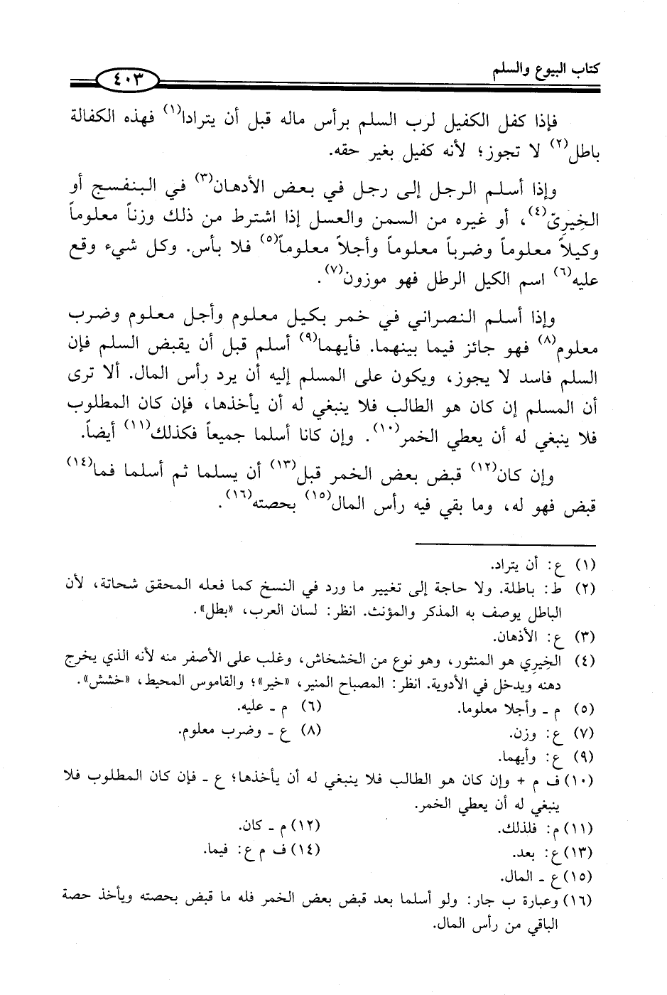 وإذا أسلم النصراني في خمر بكيل معلوم وأجل معلوم وضرب معلوم (¬8) فهو جائز فيما بينهما. فأيهما (¬9) أسلم قبل أن يقبض السلم فإن السلم فاسد لا يجوز، ويكون على المسلم إليه أن يرد رأس المال. ألا ترى أن المسلم إن كان هو الطالب فلا ينبغي له أن يأخذها، فإن كان المطلوب فلا ينبغي له أن يعطي الخمر (¬10). وإن كانا أسلما جميعاً فكذلك (¬11) أيضاً.