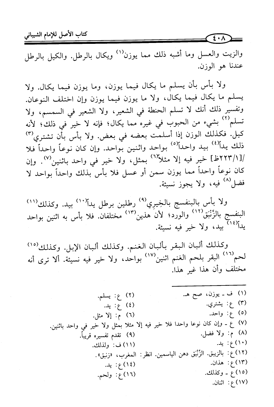 ولا بأس بأن يسلم ما يكال فيما يوزن، وما يوزن فيما يكال. ولا يسلم ما يكال فيما يكال، ولا ما يوزن فيما يوزن وإن اختلف النوعان. وتفسير ذلك أنك لا تسلم الحنطة في الشعير، ولا الشعير في السمسم، ولا تسلم (¬2) بشيء من الحبوب في غيره مما يكال؛ فإنه لا خير في ذلك؛ لأنه كيل. فكذلك الوزن إذا أسلمت بعضه في بعض. ولا بأس بأن تشتري (¬3) ذلك يداً (¬4) بيد واحداً (¬5) بواحد واثنين بواحد. وإن كان نوعاً واحداً فلا خير فيه إلا مثلاً (¬6) بمثل، ولا خير في واحد باثنين (¬7). وإن كان نوعاً واحداً مما يوزن سمن أو عسل فلا بأس بذلك واحداً بواحد لا فضل (¬8) فيه، ولا يجوز نسيئة.