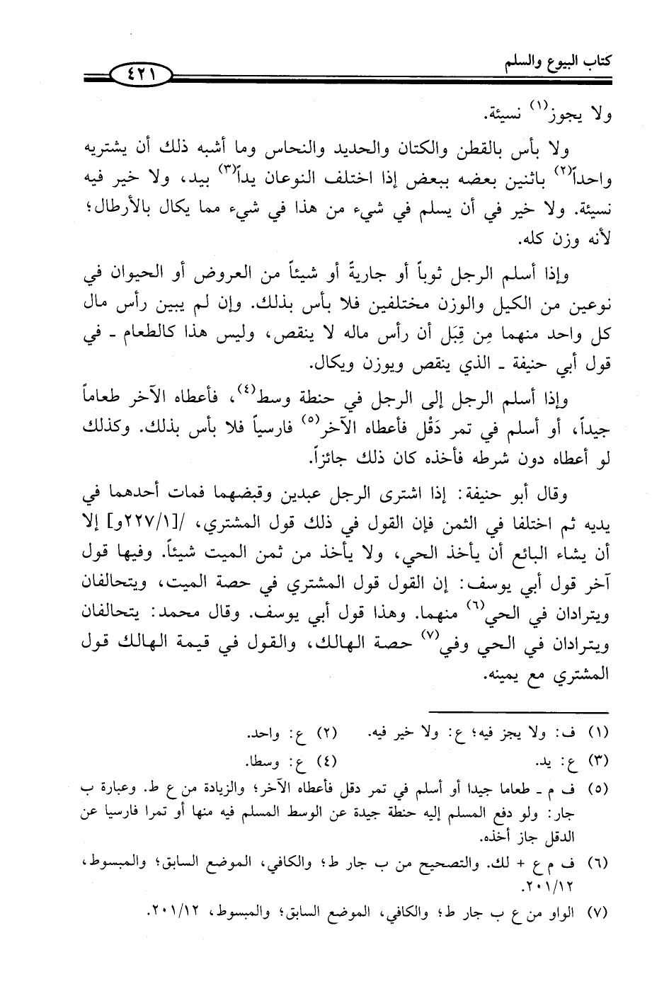 (¬7) الواو من ع ب جار ط؛ والكافي، الموضع السابق، والمبسوط، 12/ 201.