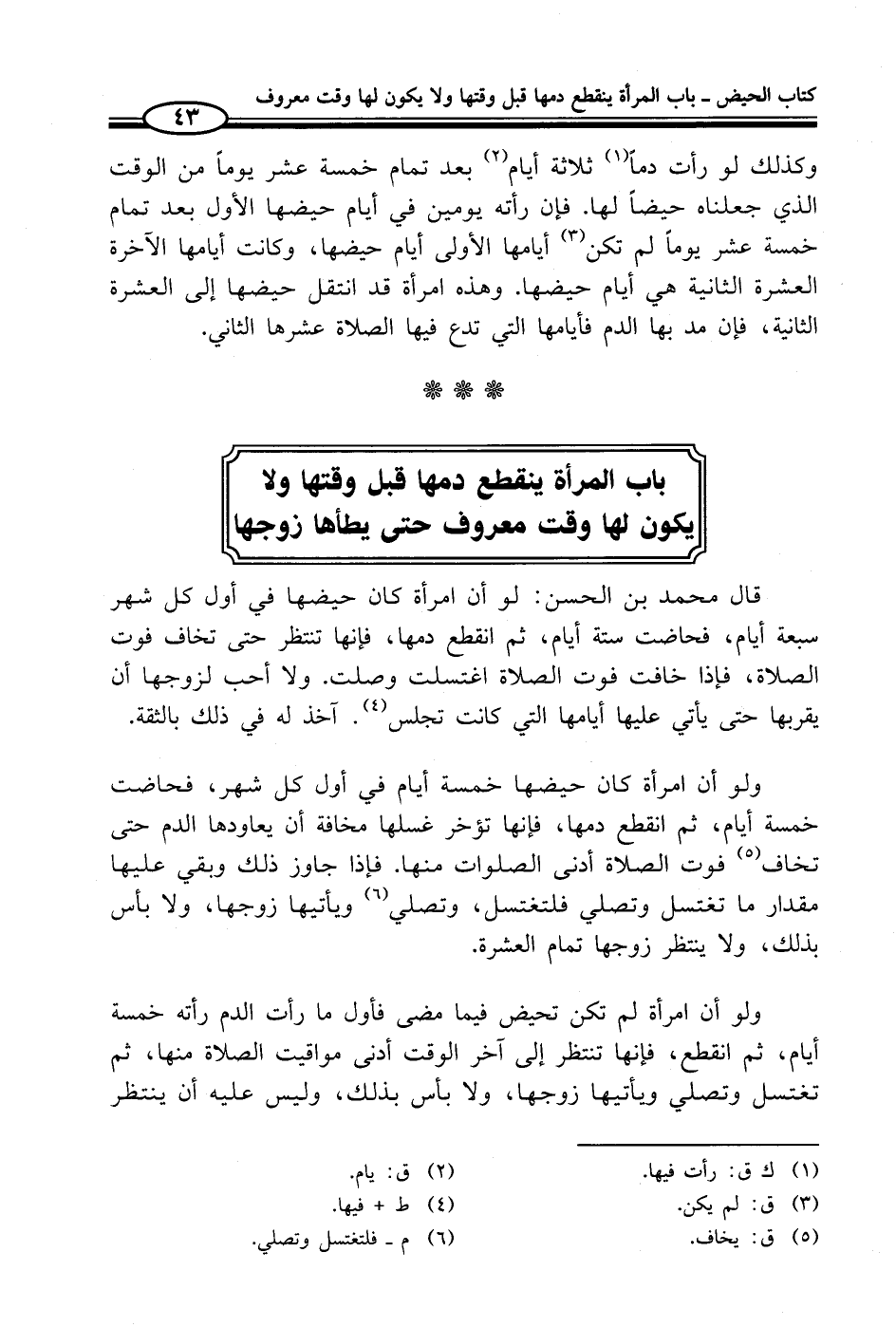 قال محمد بن الحسن: لو أن امرأة كان حيضها في أول كل شهر سبعة أيام، فحاضت ستة أيام، ثم انقطع دمها، فإنها تنتظر حتى تخاف فوت الصلاة، فإذا خافت فوت الصلاة اغتسلت وصلت. ولا أحب لزوجها أن يقربها حتى يأتي عليها أيامها التي كانت تجلس (¬4). آخذ له في ذلك بالثقة.