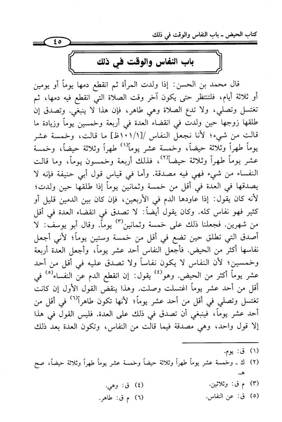 قال محمد بن الحسن: إذا ولدت المرأة ثم انقطع دمها يوماً أو يومين أو ثلاثة أيام، فلتنتظر حتى يكون آخر وقت الصلاة التي انقطع فيه دمها، ثم تغتسل وتصلي، ولا تدع الصلاة وهي طاهر، فإن هذا لا ينبغي. وتصدق إن طلقها زوجها حين ولدت في انقضاء العدة في أربعة وخمسين يوماً وزيادة ما قالت من شيء؛ لأنا نجعل النفاس ما قالت، وخمسة عشر يوماً طهراً وثلاثة حيضاً، وخمسة عشر يوماً (¬1) طهراً وثلاثة حيضاً، وخمسة عشر يوماً طهراً وثلاثة حيضاً (¬2)، فذلك أربعة وخمسون يوماً، وما قالت النفساء من شيء فهي فيه مصدقة. وأما في قياس قول أبي حنيفة فإنه لا يصدقها في العدة في أقل من خمسة وثمانين يوماً إذا طلقها حين ولدت؛ لأنه كان يقول: إذا عاودها الدم في الأربعين، فإن كان بين الدمين قليل أو كثير فهو نفاس كله. وكان يقول أيضاً: لا تصدق في انقضاء العدة في أقل من شهرين. فجعلنا ذلك على خمسة وثمانين (¬3) يوماً. وقال أبو يوسف: لا أصدق التي تطلق حين تضع في أقل من خمسة وستين يوماً؛ لأني أجعل نفاسها أكثر من الحيض. فأجعل النفاس أحد عشر يوماً، وأجعل العدة أربعة وخمسين؛ لأن النفاس لا يكون نفاسًا ولا تصدق عليه في أقل من أحد عشر يوماً أكثر من الحيض. وهو (¬4) يقول: إن انقطع الدم عن النفساء (¬5) في أقل من أحد عشر يوماً اغتسلت وصلت. وهذا ينقض القول الأول إن كانت تغتسل وتصلي في أقل من أحد عشر يوماً؛ لأنها تكون طاهراً (¬6) في أقل من أحد عشر يوماً، فينبغي أن تصدق في ذلك على العدة. فليس القول في هذا إلا قول واحد، وهي مصدقة فيما قالت من النفاس، وتكون العدة بعد ذلك