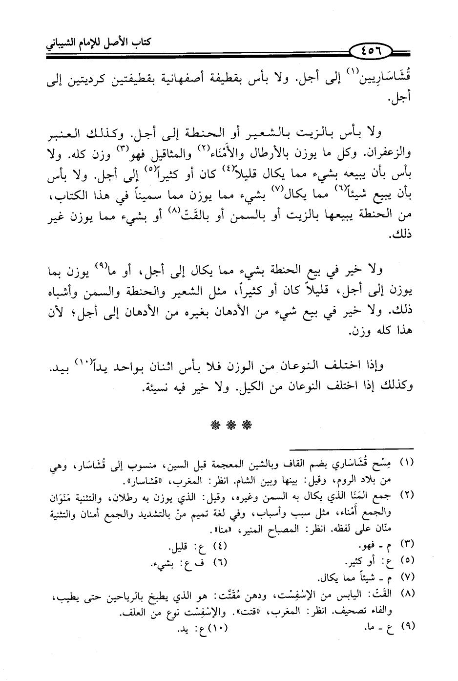 ولا بأس بالزيت بالشعير أو الحنطة إلى أجل. وكذلك العنبر والزعفران. وكل ما يوزن بالأرطال والأَمْنَاء (¬2) والمثاقيل فهو (¬3) وزن كله. ولا بأس بأن يبيعه بشيء مما يكال قليلاً (¬4) كان أو كثيراً (¬5) إلى أجل. ولا بأس بأن يبيع شيئاً (¬6) مما يكال (¬7) بشيء مما يوزن مما سميناً في هذا الكتاب، من الحنطة يبيعها بالزيت أو بالسمن أو بالقَتّ (¬8) أو بشيء مما يوزن غير ذلك.