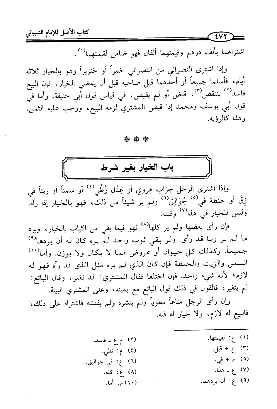 واذا اشترى النصراني من النصراني خمراً أو خنزيراً وهو بالخيار ثلاثة أيام، فأسلما جميعاً أو أحدهما قبل صاحبه قبل أن يمضي الخيار، فإن البيع فاسد (¬2) ينتقض (¬3)، قبض أو لم يقبض، في قياس قول أبي حنيفة. وأما في قول أبي يوسف ومحمد إذا قبض المشتري لزمه البيع، ووجب عليه الثمن. وهذا كالرؤية.