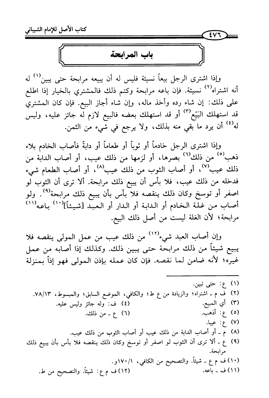 وإذا اشترى الرجل خادماً أو ثوباً أوطعاماً أو دابةً فأصاب الخادم بلاء ذهب (¬5) من ذلك (¬6) بصرها، أو لزمها من ذلك عيب، أو أصاب الدابة من ذلك عيب (¬7)، أو أصاب الثوب من ذلك عيب (¬8)، أو أصاب الطعام شيء فدخله من ذلك عيب، فلا بأس أن يبيع ذلك مرابحة. ألا ترى أن الثوب لو اصفر أو توسخ وكان ذلك ينقصه فلا بأس بأن يبيع ذلك مرابحة (¬9). ولو أصاب من غلة الخادم أو الدابة أو الدار أو العبد [شيئاً] (¬10) باعه (¬11) مرابحة؛ لأن الغلة ليست من أصل ذلك البيع.