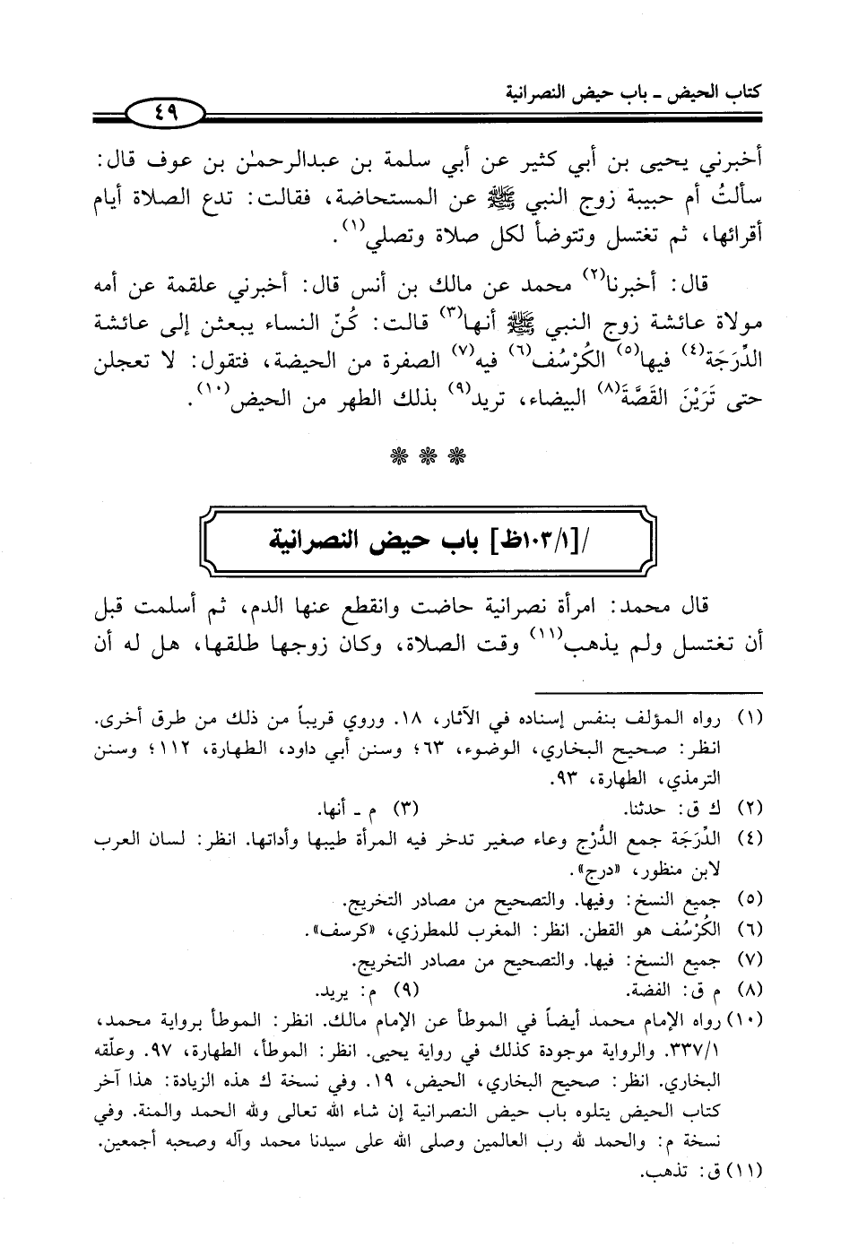 (¬10) رواه الإِمام محمد أيضاً في الموطأ عن الإِمام مالك. انظر: الموطأ برواية محمد، 1/ 337. والرواية موجودة كذلك في رواية يحيى. انظر: الموطأ، الطهارة، 97. وعلّقه البخاري. انظر: صحيح البخاري، الحيض، 19. وفي نسخة ك هذه الزيادة: هذا آخر كتاب الحيض يتلوه باب حيض النصرانية إن شاء الله تعالى ولله الحمد والمنة. وفي نسخة م: والحمد لله رب العالمين وصلى الله على سيدنا محمد وآله وصحبه أجمعين.