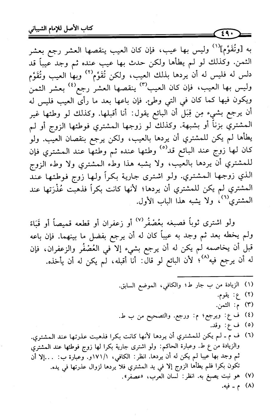 (¬6) ف م - لم يكن للمشتري أن يردها لأنها كانت بكرا فذهبت عذرتها عند المشتري. والزيادة من ع ط. وعبارة الحاكم: ولو اشترى جارية بكرا لها زوج فوطئها عند المشتري ثم وجد بها عيبا لم يكن له أن يردها. انظر: الكافي، 11/ 17 و. وعبارة ب: ... إلا أن تكون بكرا فلم يطأها الزوج إلا في يد المشتري فلا يردها لزوال عذرتها في يده.