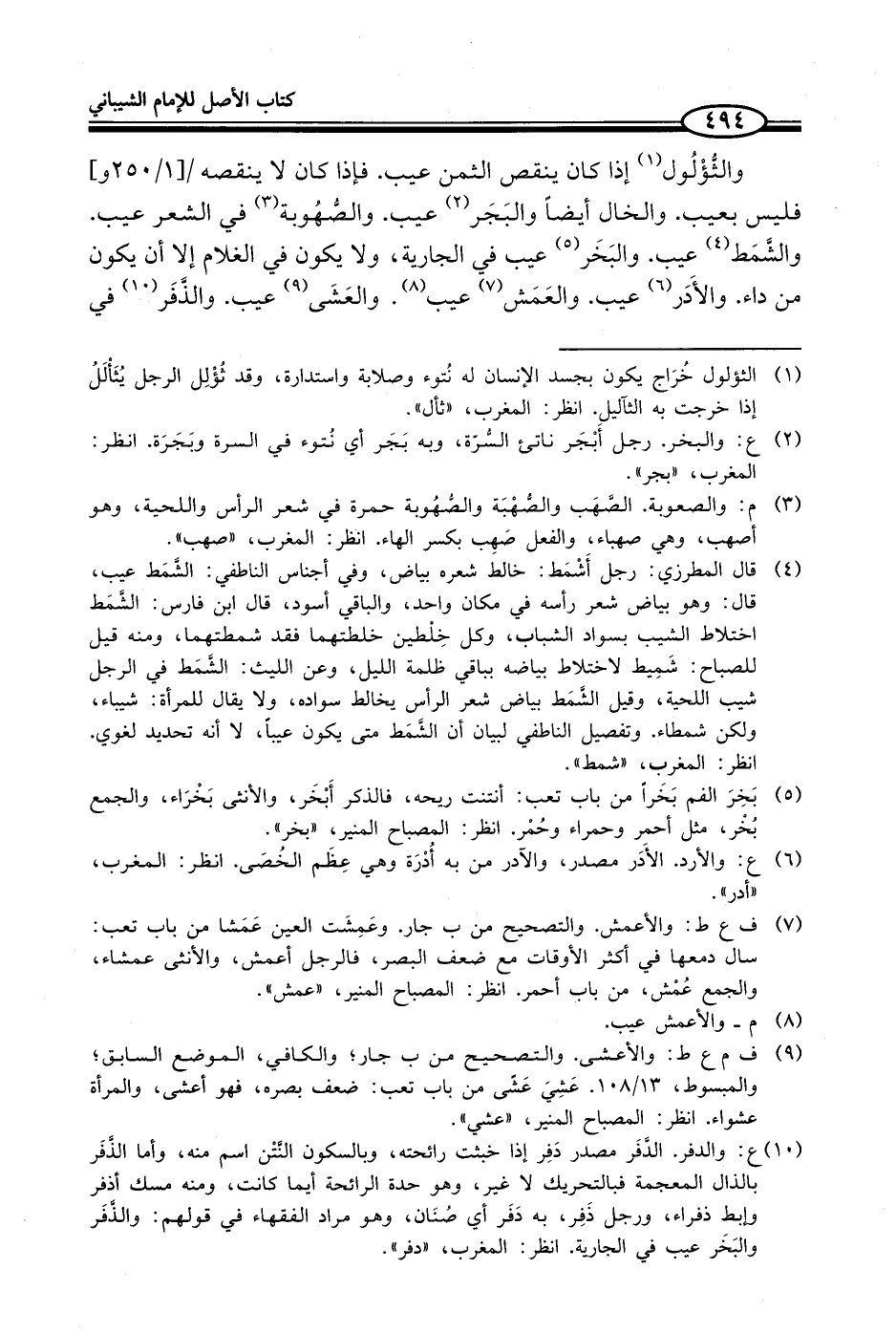 والثُّؤْلُول (¬1) إذا كان ينقص الثمن عيب. فإذا كان لا ينقصه فليس بعيب. والخال أيضاً والبَجَر (¬2) عيب. والصُّهُوبة (¬3) في الشعر عيب. والشَّمَط (¬4) عيب. والبَخَر (¬5) عيب في الجارية، ولا يكون في الغلام إلا أن يكون من داء. والأَدَر (¬6) عيب. والعَمَش (¬7) عيب (¬8). والعَشَى (¬9) عيب. والذَّفَر (¬10) في