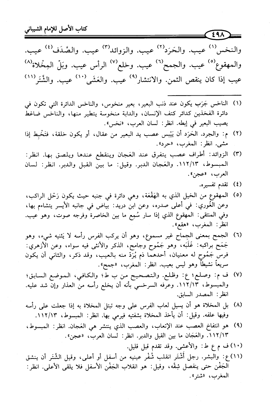 والنخس (¬1) عيب. والحَرَد (¬2) عيب. والزوائد (¬3) عيب. والصَّدَف (¬4) عيب. والمهقوع (¬5) عيب. والجمح (¬6) عيب. وخلع (¬7) الرأس عيب. وبَلّ المِخْلاة (¬8) عيب إذا كان ينقص الثمن. والانتشار (¬9) عيب. والعَشَى (¬10) عيب. والشَّتَر (¬11)