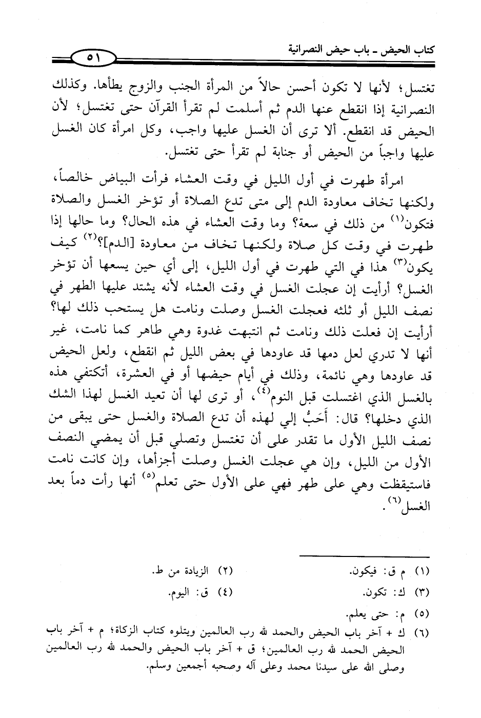 (¬6) ك + آخر باب الحيض والحمد لله رب العالمين ويتلوه كتاب الزكاة، م + آخر باب الحيض الحمد لله رب العالمين؛ ق + آخر باب الحيض والحمد لله رب العالمين وصلى الله على سيدنا محمد وعلى آله وصحبه أجمعين وسلم.