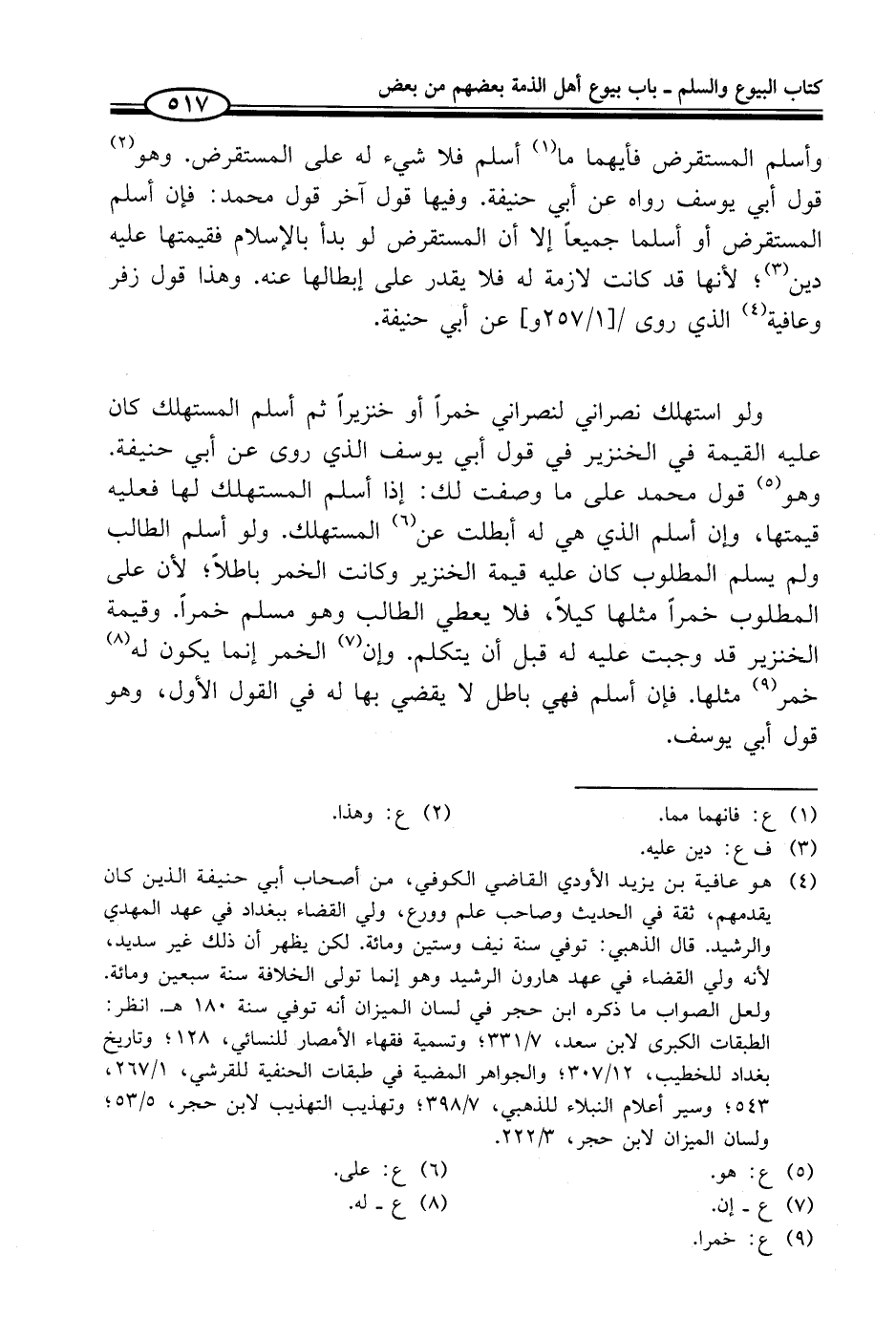 (¬4) هو عافية بن يزيد الأودي القاضي الكوفي، من أصحاب أبي حنيفة الذين كان يقدمهم، ثقة في الحديث وصاحب علم وورع، ولي القضاء ببغداد في عهد المهدي والرشيد. قال الذهبي: توفي سنة نيف وستين ومائة. لكن يظهر أن ذلك غير سديد، لأنه ولي القضاء في عهد هارون الرشيد وهو إنما تولى الخلافة سنة سبعين ومائة. ولعل الصواب ما ذكره ابن حجر في لسان الميزان أنه توفي سنة 180 هـ انظر: الطبقات الكبرى لابن سعد، 7/ 331؛ وتسمية فقهاء الأمصار للنسائي، 128؛ وتاريخ بغداد للخطيب، 2/ 307؛ والجواهر المضية في طبقات الحنفية للقرشي، 1/ 267، 543؛ وسير أعلام النبلاء للذهبي، 7/ 398؛ وتهذيب التهذيب لابن حجر، 5/ 53؛ ولسان الميزان لابن حجر، 3/ 222.