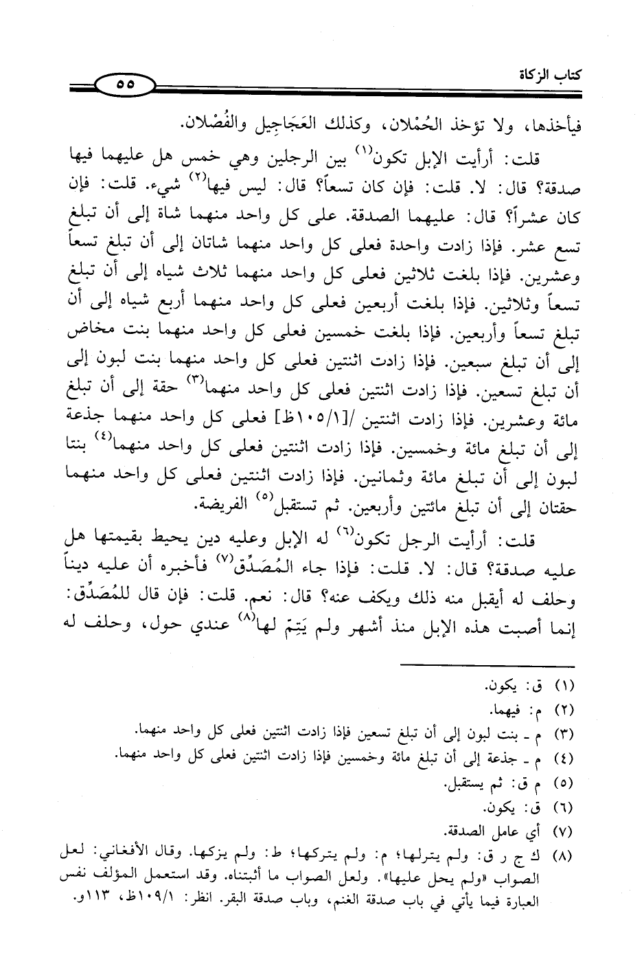 قلت: أرأيت الإبل تكون (¬1) بين الرجلين وهي خمس هل عليهما فيها صدقة؟ قال: لا. قلت: فإن كان تسعاً؟ قال: ليس فيها (¬2) شيء. قلت: فإن كان عشراً؟ قال: عليهما الصدقة. على كل واحد منهما شاة إلى أن تبلغ تسع عشر. فإذا زادت واحدة فعلى كل واحد منهما شاتان إلى أن تبلغ تسعاً وعشرين. فإذا بلغت ثلاثين فعلى كل واحد منهما ثلاث شياه إلى أن تبلغ تسعًا وثلاثين. فإذا بلغت أربعين فعلى كل واحد منهما أربع شياه إلى أن تبلغ تسعًا وأربعين. فإذا بلغت خمسين فعلى كل واحد منهم ابن ت مخاض إلى أن تبلغ سبعين. فإذا زادت اثنتين فعلى كل واحد منهما بنت لبون إلى أن تبلغ تسعين. فإذا زادت اثنتين فعلى كل واحد منهما (¬3) حقة إلى أن تبلغ مائة وعشرين. فإذا زادت اثنتين فعلى كل واحد منهما جذعة إلى أن تبلغ مائة وخمسين. فإذا زادت اثنتين فعلى كل واحد منهما (¬4) بنتا لبون إلى أن تبلغ مائة وثمانين. فإذا زادت اثنتين فعلى كل واحد منهما حقتان إلى أن تبلغ مائتين وأربعين. ثم تستقبل (¬5) الفريضة.