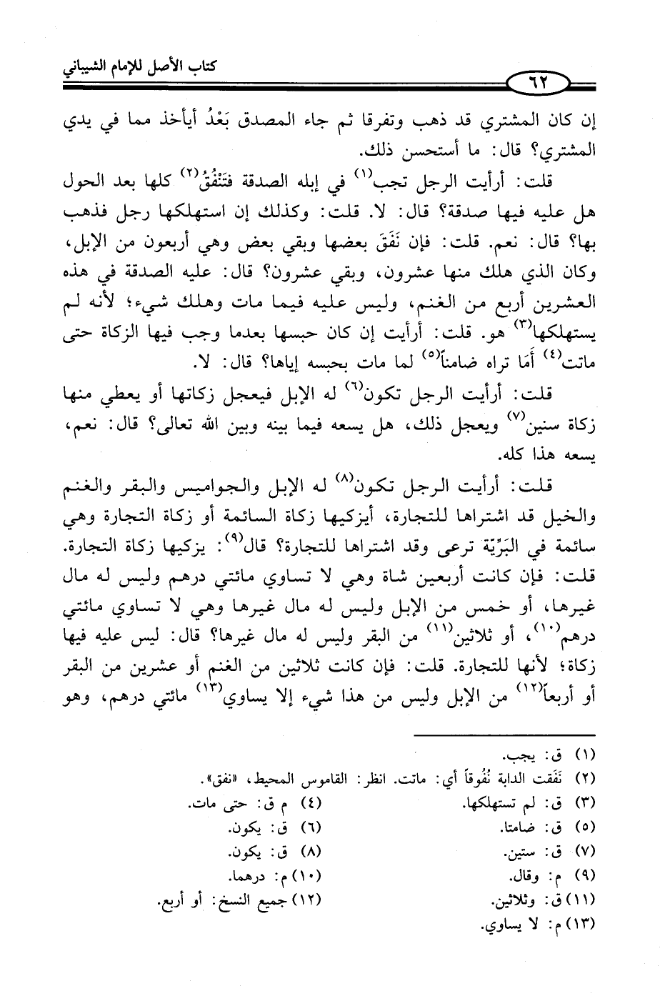 قلت: أرأيت الرجل تجب (¬1) في إبله الصدقة فتَنْفُقُ (¬2) كلها بعد الحول هل عليه فيها صدقة؟ قال: لا. قلت: وكذلك إن استهلكها رجل فذهب بها؟ قال: نعم. قلت: فإن نَفَقَ بعضها وبقي بعض وهي أربعون من الإبل، وكان الذي هلك منها عشرون، وبقي عشرون؟ قال: عليه الصدقة في هذه العشرين أربع من الغنم، وليس عليه فيما مات وهلك شيء؛ لأنه لم يستهلكها (¬3) هو. قلت: أرأيت إن كان حبسها بعد ما وجب فيها الزكاة حتى ماتت (¬4) أَمَا تراه ضامنًا (¬5) لما مات بحبسه إياها؟ قال: لا.