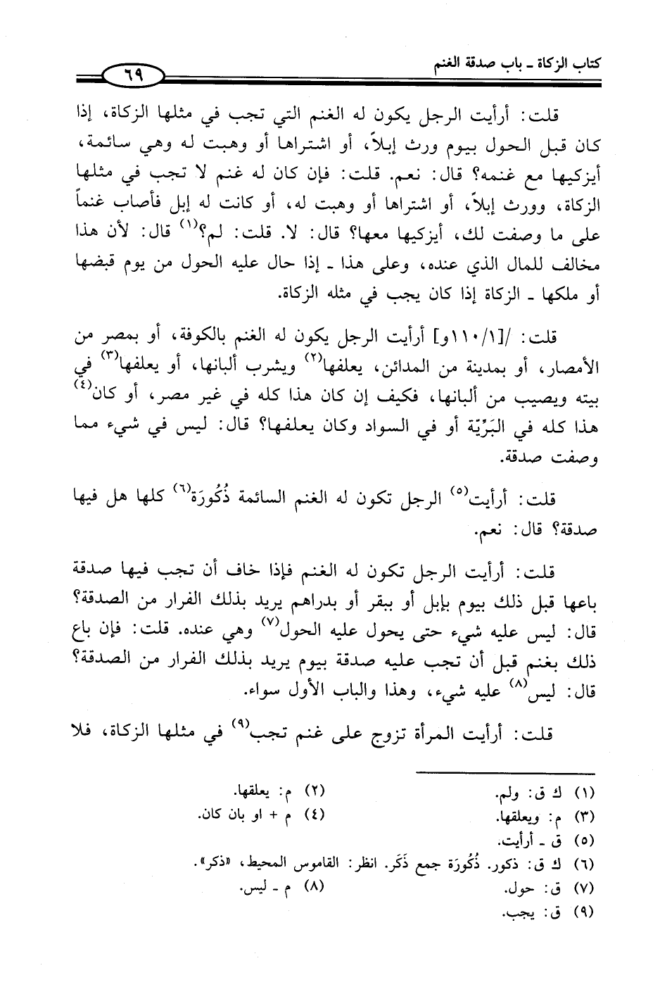 قلت: أرأيت الرجل تكون له الغنم فإذا خاف أن تجب فيها صدقة باعها قبل ذلك بيوم بإبل أو ببقر أو بدراهم يريد بذلك الفرار من الصدقة؟ قال: ليس عليه شيء حتى يحول عليه الحول (¬7) وهي عنده. قلت: فإن باع ذلك بغنم قبل أن تجب عليه صدقة بيوم يريد بذلك الفرار من الصدقة؟ قال: ليس (¬8) عليه شيء، وهذا والباب الأول سواء.