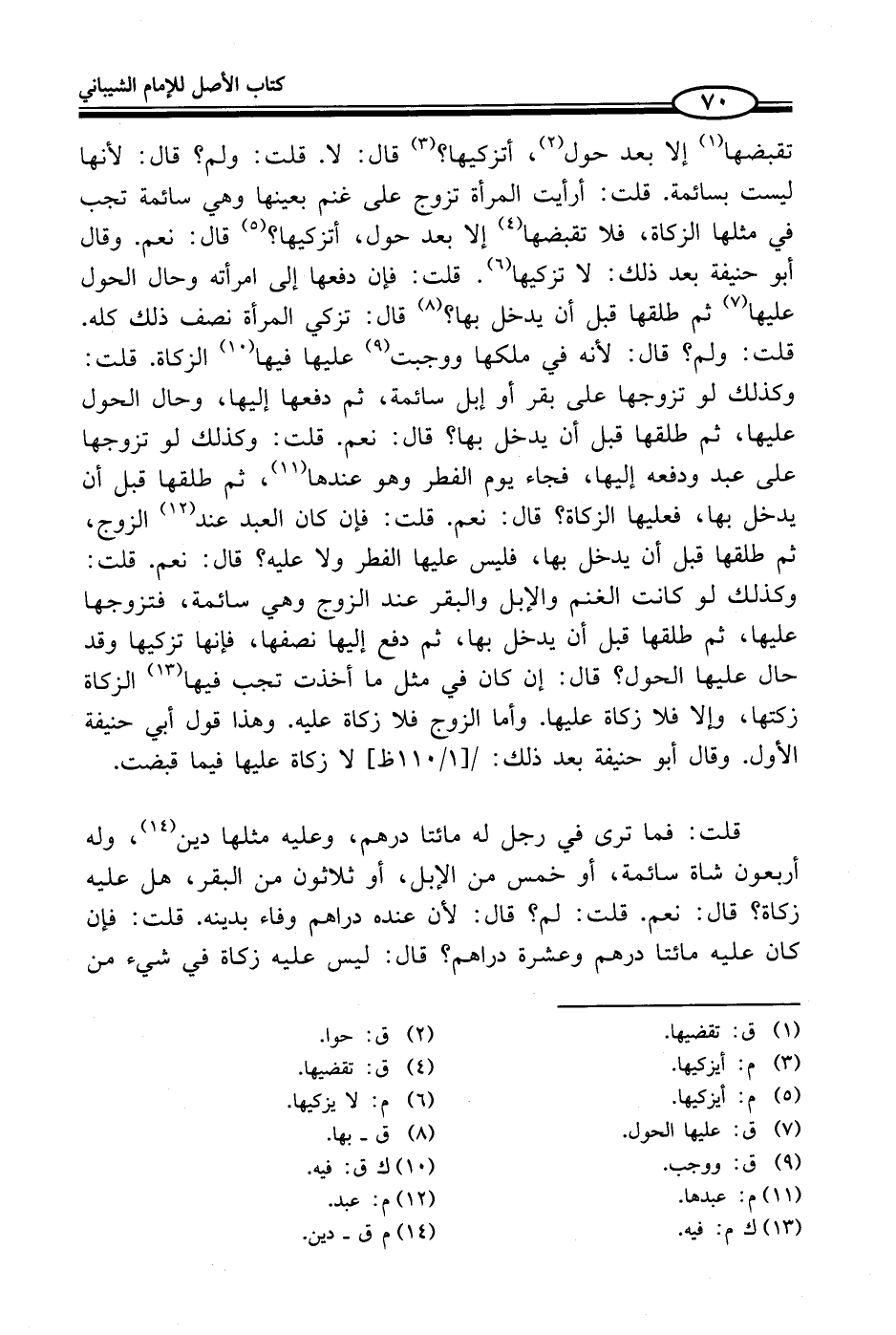 قلت: فما ترى في رجل له مائتا درهم، وعليه مثلها دين (¬14)، وله أربعون شاة سائمة، أو خمس من الإبل، أو ثلاثون من البقر، هل عليه زكاة؟ قال: نعم. قلت: لم؟ قال: لأن عنده دراهم وفاء بدينه. قلت: فإن كان عليه مائتا درهم وعشرة دراهم؟ قال: ليس عليه زكاة في شيء من