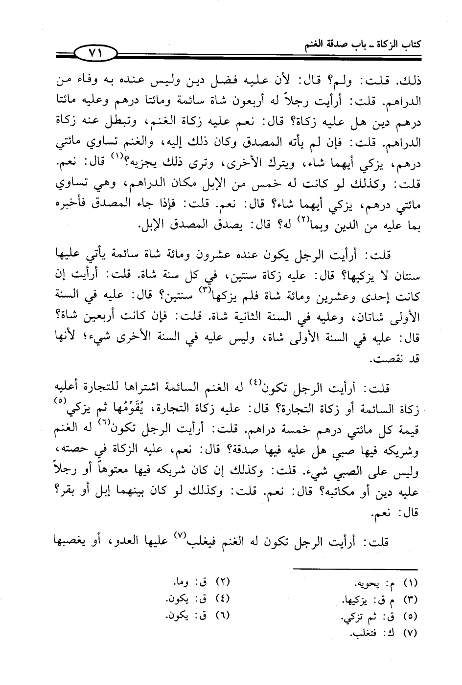 قلت: أرأيت الرجل تكون (¬4) له الغنم السائمة اشتراها للتجارة أعليه زكاة السائمة أو زكاة التجارة؟ قال: عليه زكاة التجارة، يُقَوِّمُها ثم يزكي (¬5) قيمة كل مائتي درهم خمسة دراهم. قلت: أرأيت الرجل تكون (¬6) له الغنم وشريكه فيها صبي هل عليه فيها صدقة؟ قال: نعم، عليه الزكاة في حصته، وليس على الصبي شيء. قلت: وكذلك إن كان شريكه فيها معتوهاً أو رجلاً عليه دين أو مكاتبه؟ قال: نعم. قلت: وكذلك لو كان بينهما إبل أو بقر؟ قال: نعم.