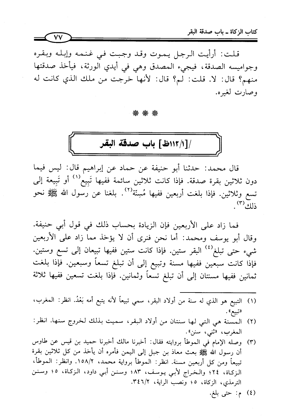 قال محمد: حدثنا أبو حنيفة عن حماد عن إبراهيم قال: ليس فيما دون ثلاثين بقرة صدقة. فإذا كانت ثلاثين سائمة ففيها تَبِيع (¬1) أو تَبِيعة إلى تسع وثلاثين. فإذا بلغت أربعين ففيها مُسِنّة (¬2). بلغنا عن رسول الله - صلى الله عليه وسلم - نحو ذلك (¬3).