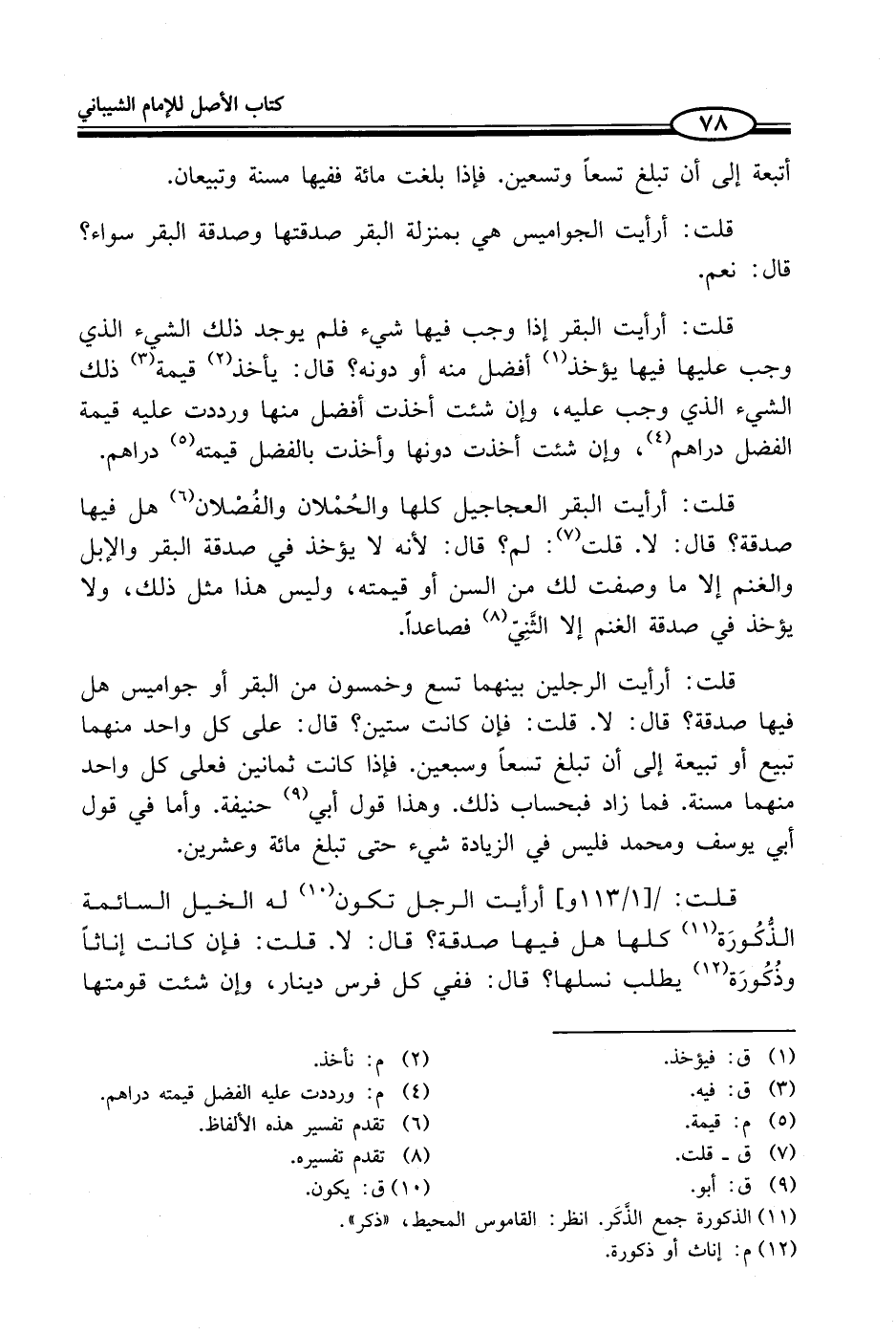 قلت: أرأيت الرجلين بينهما تسع وخمسون من البقر أو جواميس هل فيها صدقة؟ قال: لا. قلت: فإن كانت ستين؟ قال: على كل واحد منهما تبيع أو تبيعة إلى أن تبلغ تسعاً وسبعين. فإذا كانت ثمانين فعلى كل واحد منهما مسنة. فما زاد فبحساب ذلك. وهذا قول أبي (¬9) حنيفة. وأما في قول أبي يوسف ومحمد فليس في الزيادة شيء حتى تبلغ مائة وعشرين.