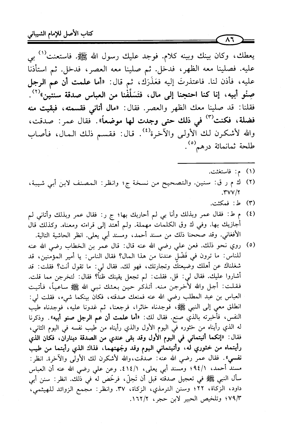 (¬5) روي نحو ذلك. فعن علي - رضي الله عنه - قال: قال عمر بن الخطاب - رضي الله عنه - للناس: ما ترون في فَضْل عندنا من هذا المال؟ فقال الناس: يا أمير المؤمنين، قد شغلناك عن أهلك وضيعتك وتجارتك، فهو لك. فقال لي: ما تقول أنت؟ فقلت: قد أشاروا عليك. فقال لي: قل. فقلت: لم تجعل يقينك ظنا؟ فقال: لتخرجن مما قلت. فقلت: أجل والله لأخرجن منه. أتذكر حين بعثك نبي الله - صلى الله عليه وسلم - ساعياً، فأتيت العباس بن عبد المطلب - رضي الله عنه - فمنعك صدقته، فكان بينكما شيء، فقلت لي: انطلق معي إلى النبي - صلى الله عليه وسلم -، فوجدناه خاثرا، فرجعنا، ثم غدونا عليه، فوجدناه طيب النفس، فأخبرته بالذي صنع. فقال لك: "أما علمت أن عم الرجل صنو أبيه". وذكرنا له الذي رأيناه من خثوره في اليوم الأول والذي رأيناه من طيب نفسه في اليوم الثاني، فقال: "إنكما أتيتماني في اليوم الأول وقد بقى عندي من الصدقة ديناران، فكان الذي رأيتماه من خثوري له، وأتيتماني اليوم وقد وجّهتهما، فذاك الذي رأيتما من طيب نفسي". فقال عمر - رضي الله عنه -: صدقت، والله لأشكرن لك الأولى والآخرة. انظر: مسند أحمد، 1/ 94؛ ومسند أبي يعلى، 1/ 414. وعن علي - رضي الله عنه - أن العباس سأل النبي - صلى الله عليه وسلم - في تعجيل صدقته قبل أن تَحِل، فرخّص له في ذلك. انظر: سنن أبي داود، الزكاة، 22؛ وسنن الترمذي، الزكاة، 37. وانظر: مجمع الزوائد للهيثمي، 3/ 79؛ وتلخيص الحبير لابن حجر، 2/ 162.