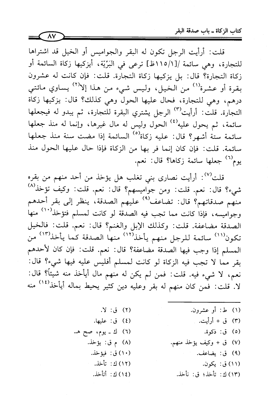 قلت (¬7): أرأيت نصارى بني تغلب هل يؤخذ من أحد منهم من بقره شيء؟ قال: نعم. قلت: ومن جواميسهم؟ قال: نعم. قلت: وكيف تؤخذ (¬8) منهم صدقاتهم؟ قال: تضاعف (¬9) عليهم الصدقة، ينظر إلى بقر أحدهم وجواميسه، فإذا كانت مما تجب فيه الصدقة لو كانت لمسلم فتؤخذ (¬10) منها الصدقة مضاعفة. قلت: وكذلك الإبل والغنم؟ قال: نعم. قلت: فالخيل تكون (¬11) سائمة للرجل منهم يأخذ (¬12) منها الصدقة كما يأخذ (¬13) من المسلم إذا وجب فيها الصدقة مضاعفة؟ قال: نعم. قلت: فإن كان لأحدهم بقر مما لا تجب فيه الزكاة لو كانت لمسلم أفليس عليه فيها شيء؟ قال: نعم، لا شيء فيه. قلت: فمن لم يكن له منهم مال أيأخذ منه شيئاً؟ قال: لا. قلت: فمن كان منهم له بقر وعليه دين كثير يحيط مسألة أيأخذ (¬14) منه