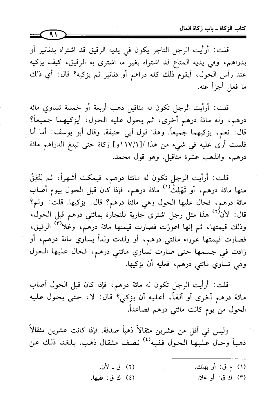 قلت: أرأيت الرجل تكون له مائتا درهم، فيمكث أشهراً، ثم يُنْفِقُ منها مائة درهم، أو تَهْلِكُ (¬1) مائة درهم، فإذا كان قبل الحول بيوم أصاب مائة درهم، فحال عليها الحول وهي مائتا درهم؟ قال: يزكيها. قلت: ولم؟ قال: لأن (¬2) هذا مثل رجل اشترى جارية للتجارة بمائتي درهم قبل الحول، وذلك قيمتها، ثم إنها اعورّت فصارت قيمتها مائة درهم، وغلا (¬3) الرقيق، فصارت قيمتها عوراء مائتي درهم، أو ولدت ولداً يساوي مائة درهم، أو زادت في جسمها حتى صارت تساوي مائتي درهم، فحال عليها الحول وهي تساوي مائتي درهم، فعليه أن يزكيها.