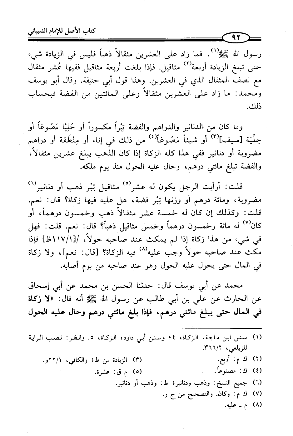 محمد عن أبي يوسف قال: حدثنا الحسن بن محمد عن أبي إسحاق عن الحارث عن علي بن أبي طالب عن رسول الله - صلى الله عليه وسلم -أنه قال: "لا زكاة في المال حتى يبلغ مائتي درهم، فإذا بلغ مائتي درهم وحال عليه الحول