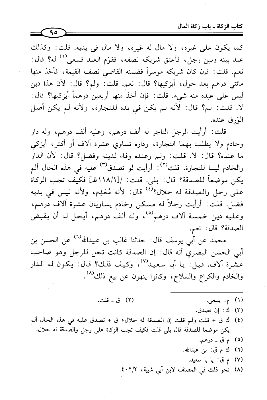 (¬4) ك ق + قلت ولم قلت إن الصدقة له حلال؛ ق + تصدق عليه في هذه الحال ألم يكن موضعا للصدقة قال بلى قلت فكيف تجب الزكاة على رجل والصدقة له حلال.