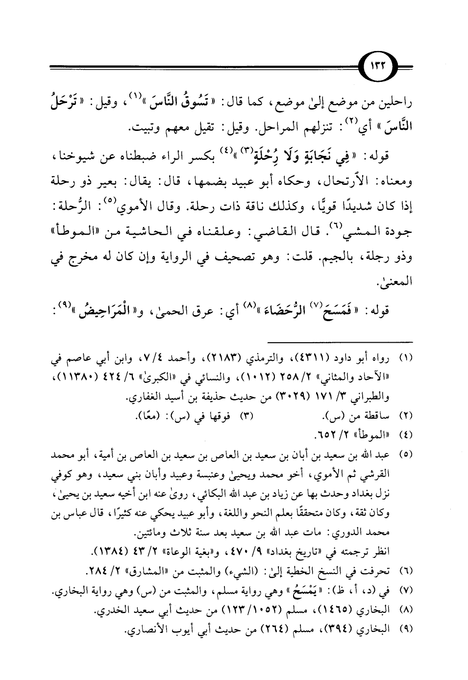 قوله: "في نَجَابَةٍ وَلَا رُحْلَةٍ (¬3) " (¬4) بكسر الراء ضبطناه عن شيوخنا، ومعناه: الارتحال، وحكاه أبو عبيد بضمها، قال: يقال: بعير ذو رحلة إذا كان شديدًا قويًّا، وكذلك ناقة ذات رحلة. وقال الأموي (¬5): الرُّحلة: جودة المشي (¬6). قال القاضي: وعلقناه في الحاشية من "الموطأ" وذو رجلة، بالجيم. قلت: وهو تصحيف في الرواية وإن كان له مخرج في المعنى.
