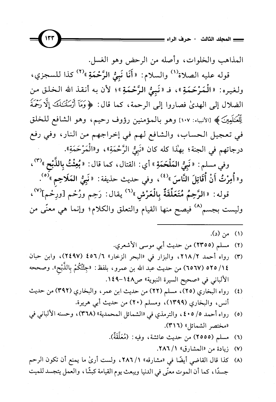 قوله عليه الصلاة (¬1) والسلام: "أَنَا نَبِيُّ الرَّحْمَة" (¬2) كذا للسجزي، ولغيره: "الْمَرْحَمَةِ"، فـ "نَبِيُّ الرَّحْمَةِ"؛ لأن به أنقذ الله الخلق من الضلال إلى الهدى فصاروا إلى الرحمة، كما قال: {وَمَا أَرْسَلْنَاكَ إِلَّا رَحْمَةً لِلْعَالَمِينَ} [الأنبياء: 107] وهو بالمؤمنين رؤوف رحيم، وهو الشافع للخلق في تعجيل الحساب، والشافع لهم في إخراجهم من النار، وفي رفع درجاتهم في الجنة؛ بهذا كله كان "نَبِيُّ الرَّحْمَةِ"، و"الْمَرْحَمَةِ".