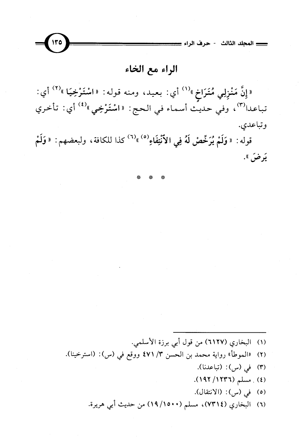 " إِنَّ مَنْزِلِي مُتَرَاخٍ" (¬1) أي: بعيد، ومنه قوله: "اسْتَرْخِيَا" (¬2) أي: تباعدا (¬3)، وفي حديث أسماء في الحج: "اسْتَرْخِي" (¬4) أي: تأخري وتباعدي.
