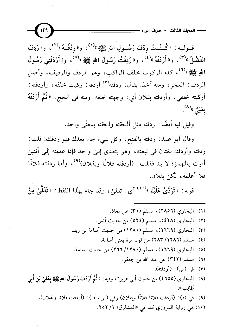 قوله: "كنْتُ رِدْفَ رَسُولِ اللهِ - صلى الله عليه وسلم -" (¬1)، و"رِدْفُهُ" (¬2)، و"رَدِفَ الفَضْلُ" (¬3)، و"أَرْدَفَهُ" (¬4)، و"رَدِفْتُ رَسُولَ اللهِ - صلى الله عليه وسلم -" (¬5)، و"أَرْدَفَنِي رَسُولُ اللهِ - صلى الله عليه وسلم -" (¬6)، كله الركوب خلف الراكب، وهو الردف والرديف، وأصل الردف: العجز، ومنه أخذ. يقال: ردفته (¬7) أردفه: ركبت خلفه، وأردفته: أركبته خلفي، وأردفته بفلان أي: وجهته خلفه. ومنه في الحج: "ثُمَّ أَرْدَفَهُ بِعَلِيٍّ" (¬8).