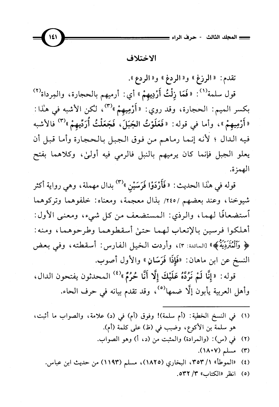 قول سلمة (¬1): "فَمَا زِلْتُ أَرْدِيهِمْ" أي: أرميهم بالحجارة، والمِرداة (¬2) بكسر الميم: الحجارة، وقد روي: "أَرْمِيهِمْ" (¬3)، لكن الأشبه في هذا: "أَرْمِيهِمْ"، وأما في قوله: "فَعَلَوْتُ الجَبَلَ، فَجَعَلْتُ أُرَدِّيهِمْ" (3) فالأشبه فيه الدال؛ لأنه إنما رماهم من فوق الجبل بالحجارة وأما قبل أن يعلو الجبل فإنما كان يرميهم بالنبل فالرمي فيه أولى، وكلاهما بفتح الهمزة.