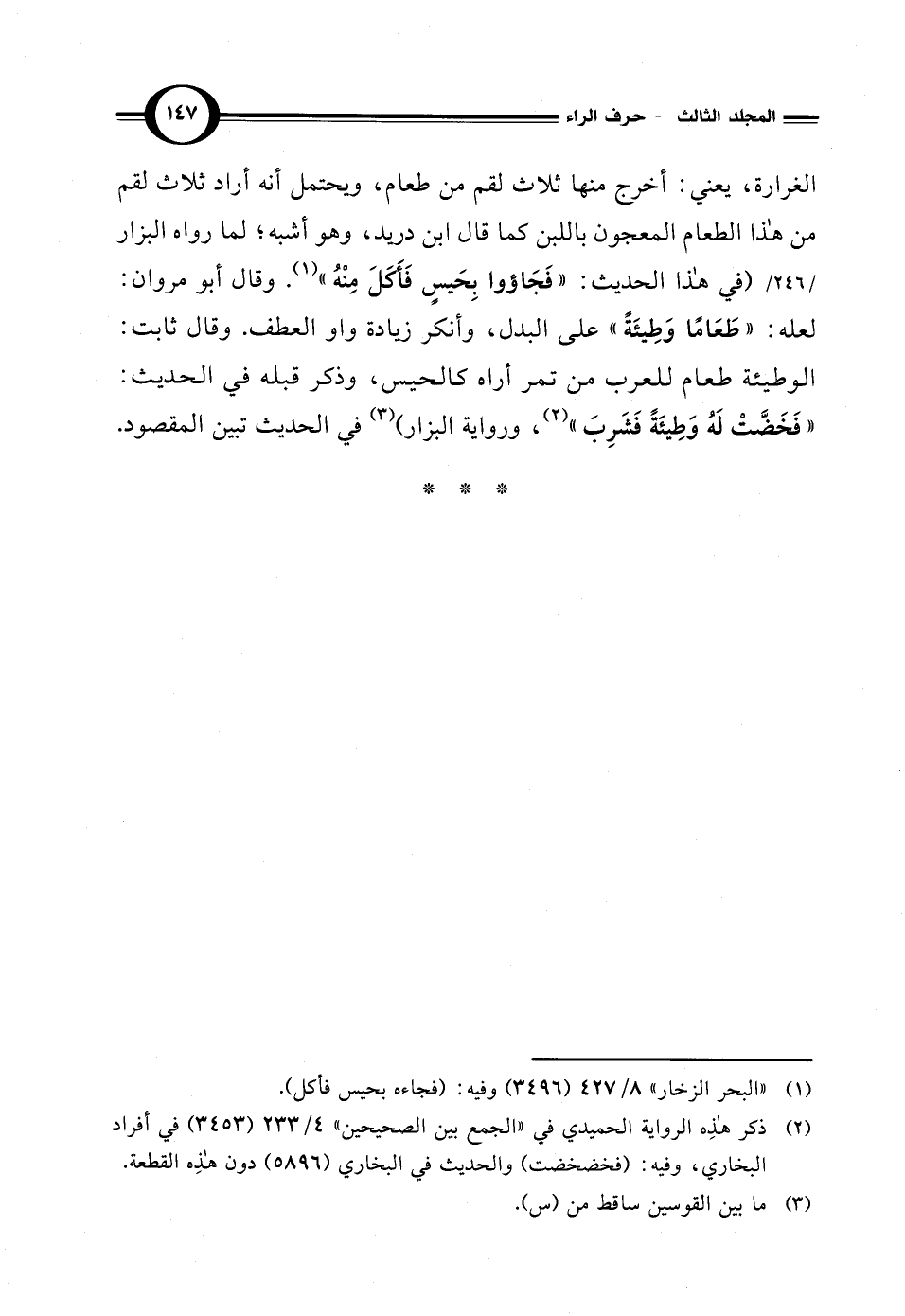 الغرارة، يعني: أخرج منها ثلاث لقم من طعام، ويحتمل أنه أراد ثلاث لقم من هذا الطعام المعجون باللبن كما قال ابن دريد، وهو أشبه؛ لما رواه البزار (في هذا الحديث: "فَجَاؤوا بِحَيسٍ فَأَكَلَ مِنْهُ" (¬1). وقال أبو مروان: لعله: "طَعَامًا وَطِيئَةً" على البدل، وأنكر زيادة واو العطف. وقال ثابت: الوطيئة طعام للعرب من تمر أراه كالحيس، وذكر قبله في الحديث: "فَخَضَّتْ لَهُ وَطِيئَةً فَشَرِبَ" (¬2)، ورواية البزار) (¬3) في الحديث تبين المقصود.