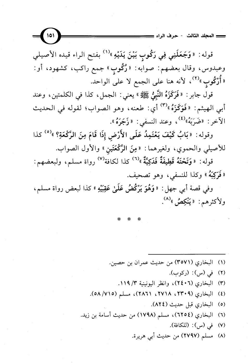 قوله: "وَجَعَلَنِي في رَكُوبٍ بَيْنَ يَدَيْهِ" (¬1) بفتح الراء قيده الأصيلي وعبدوس، وقال بعضهم: صوابه: "رُكوبٍ" جمع راكب، كشهود، أو: "أُرْكُوبٍ" (¬2)، لأنه هنا على الجمع لا على الواحد.