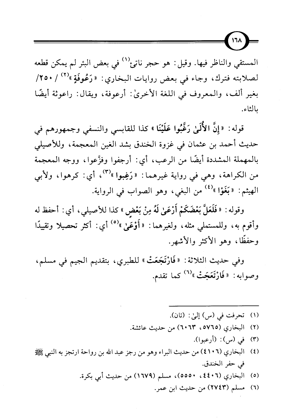 المستقي والناظر فيها. وقيل: هو حجر ناتئ (¬1) في بعض البئر لم يمكن قطعه لصلابته فترك، وجاء في بعض روايات البخاري: "رَعُوفَةٍ" (¬2) بغير ألف، والمعروف في اللغة الأخرى: أرعوفة، ويقال: راعوثة أيضًا بالثاء.
