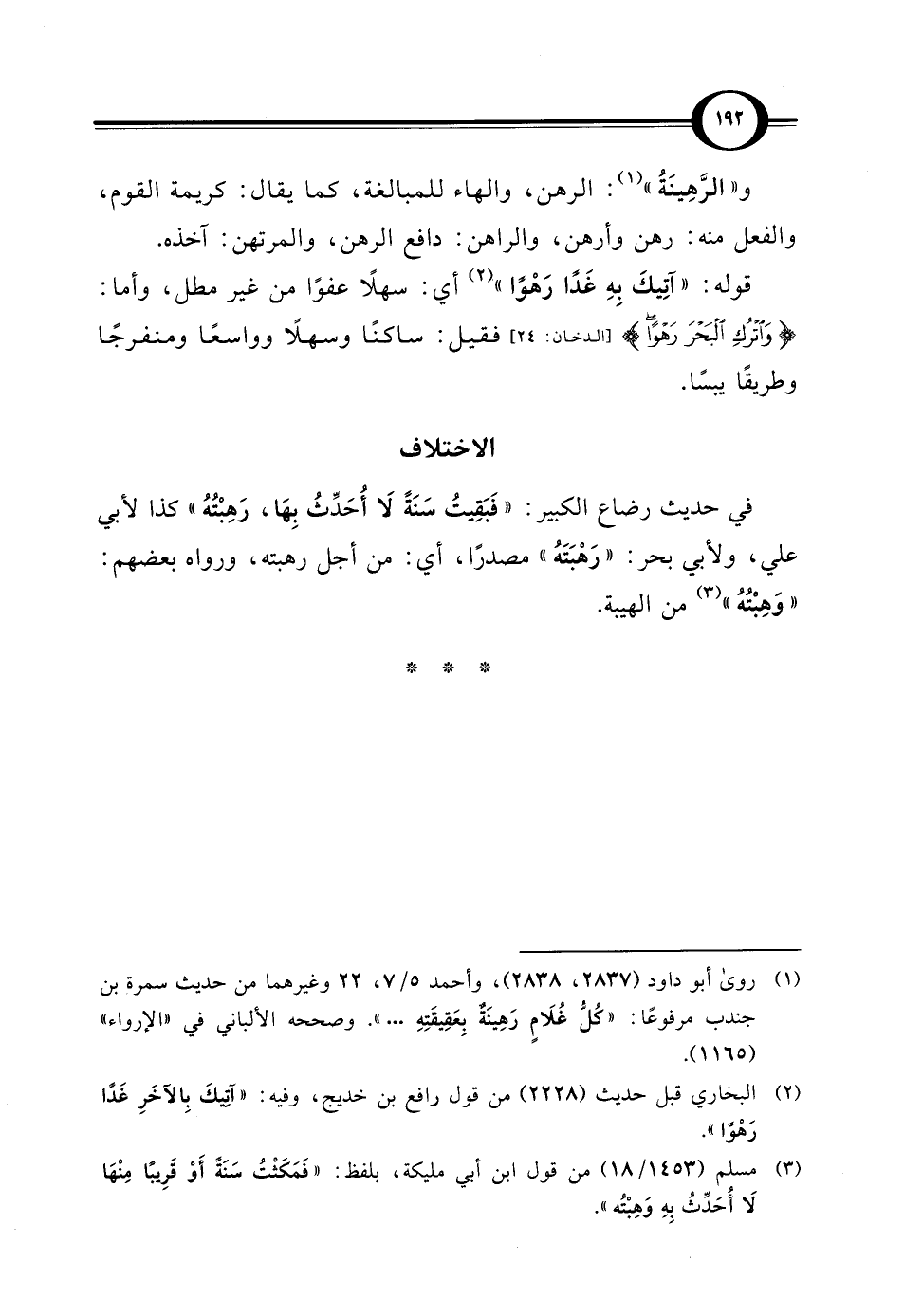و"الرَّهِينَةُ" (¬1): الرهن، والهاء للمبالغة، كما يقال: كريمة القوم، والفعل منه: رهن وأرهن، والراهن: "دافع الرهن، والمرتهن: آخذه. قوله: "آتِيكَ بِهِ غَدًا رَهْوًا" (¬2) أي: سهلًا عفوًا من غير مطل، وأما: {وَاتْرُكِ الْبَحْرَ رَهْوًا} [الدخان: 24] فقيل: ساكنًا وسهلًا وواسعًا ومنفرجًا وطريقًا يبسًا.