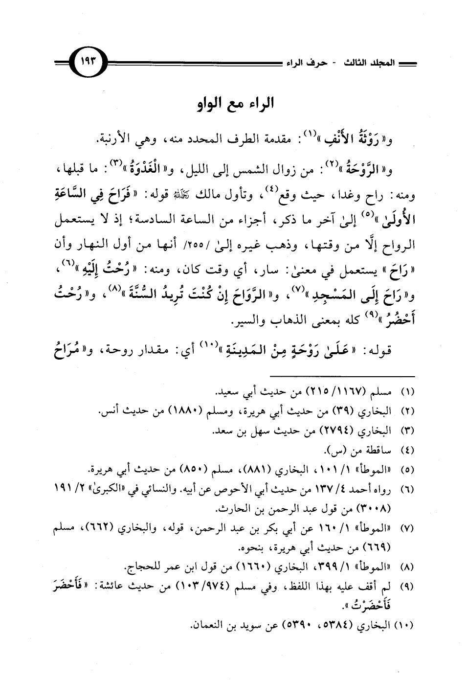 و"الرَّوْحَةُ" (¬2): من زوال الشمس إلى الليل، و"الْغَدْوَةُ" (¬3): ما قبلها، ومنه: راح وغدا، حيث وقع (¬4)، وتأول مالك - رحمه الله - قوله: "فَرَاحَ في السَّاعَةِ الأُولَى" (¬5) إلى آخر ما ذكر، أجزاء من الساعة السادسة؛ إذ لا يستعمل الرواح إلاَّ من وقتها، وذهب غيره إلى أنها من أول النهار وأن "رَاحَ" يستعمل في معنى: سار، أي وقت كان، ومنه: "رُحْتُ إِلَيْهِ" (¬6)، و"رَاحَ إِلَى المَسْجِدِ" (¬7)، و"الرَّوَاحَ إِنْ كُنْتَ تُرِيدُ السُّنَّةَ" (¬8)، و"رُحْتُ أَحْضُرُ" (¬9) كله بمعنى الذهاب والسير.