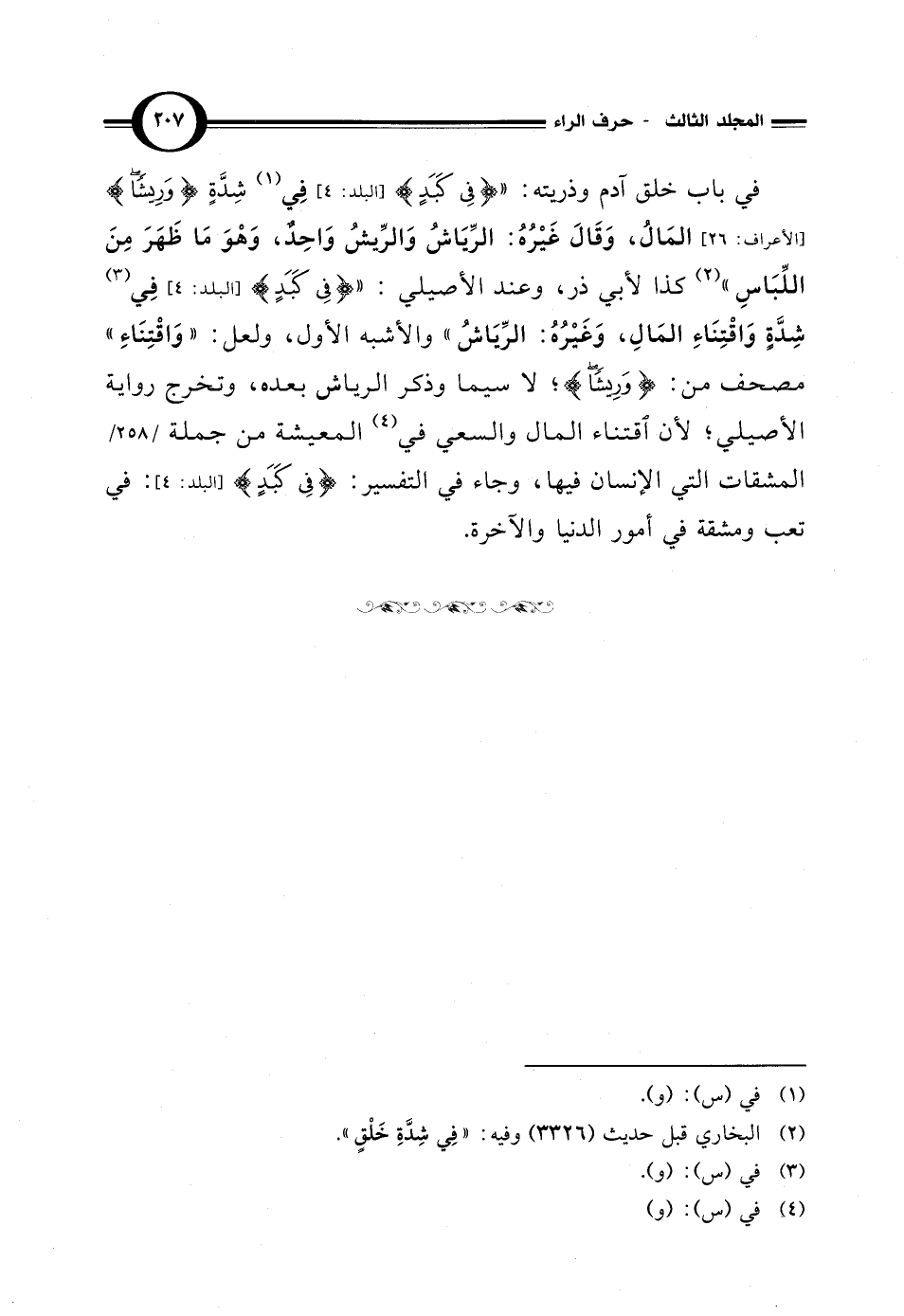 في باب خلق آدم وذريته: " {فِي كَبَدٍ} [البلد: 4] في (¬1) شِدَّةٍ {وَرِيشًا} [الأعراف: 26] المَالُ، وَقَالَ غَيْرُهُ: الرِّيَاشُ وَالرّيشُ وَاحِدٌ، وَهْوَ مَا ظَهَرَ مِنَ اللِّبَاسِ" (¬2) كذا لأبي ذر، وعند الأصيلي: " {فِي كَبَدٍ} [البلد: 4] في (¬3) شِدَّةٍ وَاقْتِنَاءِ المَالِ، وَغَيْرُهُ: الرِّيَاشُ" والأشبه الأول، ولعل: "وَاقْتِنَاءِ" مصحف من: {وَرِيشًا} [الأعراف: 26]؛ لا سيما وذكر الرياش بعده، وتخرج رواية الأصيلي؛ لأن اقتناء المال والسعي في (¬4) المعيشة من جملة المشقات التي الإنسان فيها، وجاء في التفسير: {فِي كَبَدٍ} [البلد: 4]: في تعب ومشقة في أمور الدنيا والآخرة.