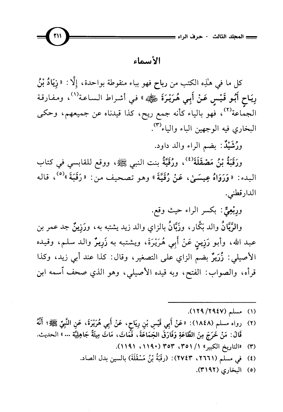 والرَّيَّانُ والد بَكَّار، وزَبَّانُ بالزاي والد زيد يشتبه به، ورَزِينٌ جد عمر بن عبد الله، وأبو رَزِينٍ عَنْ أَبِي هُرَيْرَةَ، ويشتبه به زَرِيرٌ والد سلم، وقيده الأصيلي: زُرَيرٌ بضم الزاي على التصغير، وقال: كذا عند أبي زيد، وكذا قرأه، والصواب: الفتح، وبه قيده الأصيلي، وهو الذي صحف اسمه ابن