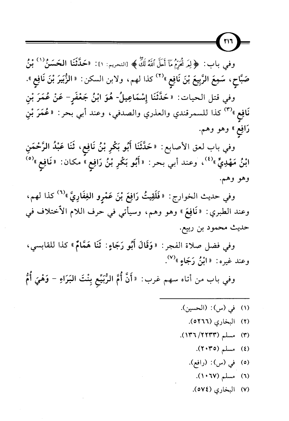 وفي باب لعق الأصابع: "حَدَّثَنَا أَبُو بَكْرِ بْنُ نَافِعٍ، ثَنَا عَبْدُ الرَّحْمَنِ ابْنُ مَهْدِيٍّ" (¬4)، وعند أبي بحر: "أَبُو بَكْرِ بْنُ رَافِعٍ" مكان: "نَافِعٍ" (¬5) وهو وهم.